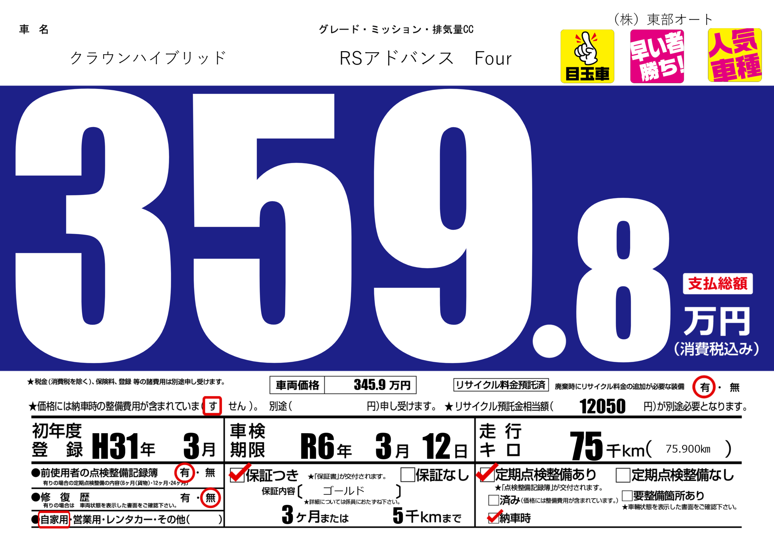 | 車名 | クラウンハイブリッド | グレード ミッション 排気量 |