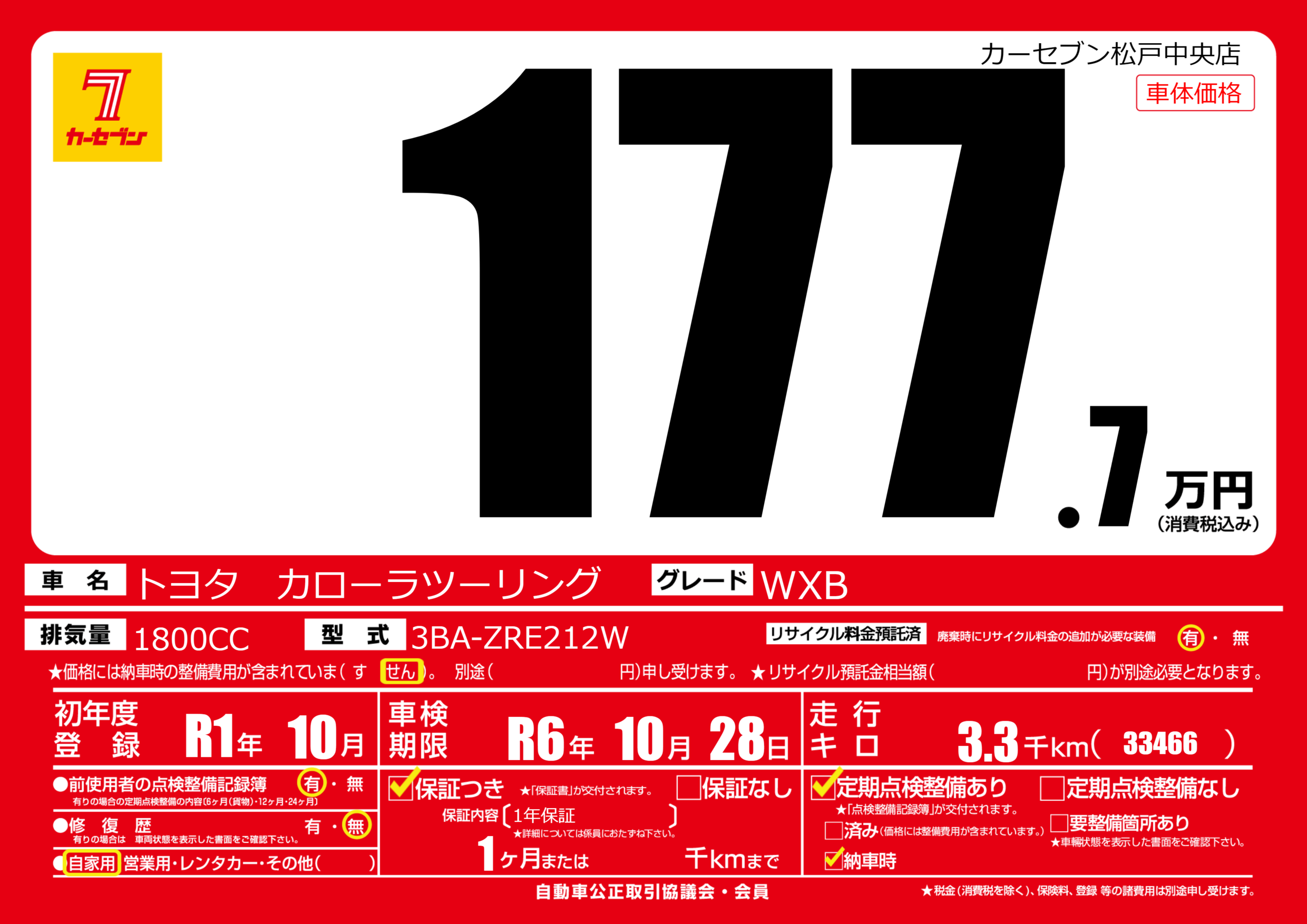 | 車名 | トヨタ カローラツーリング | グレード ミッション 排気量 |