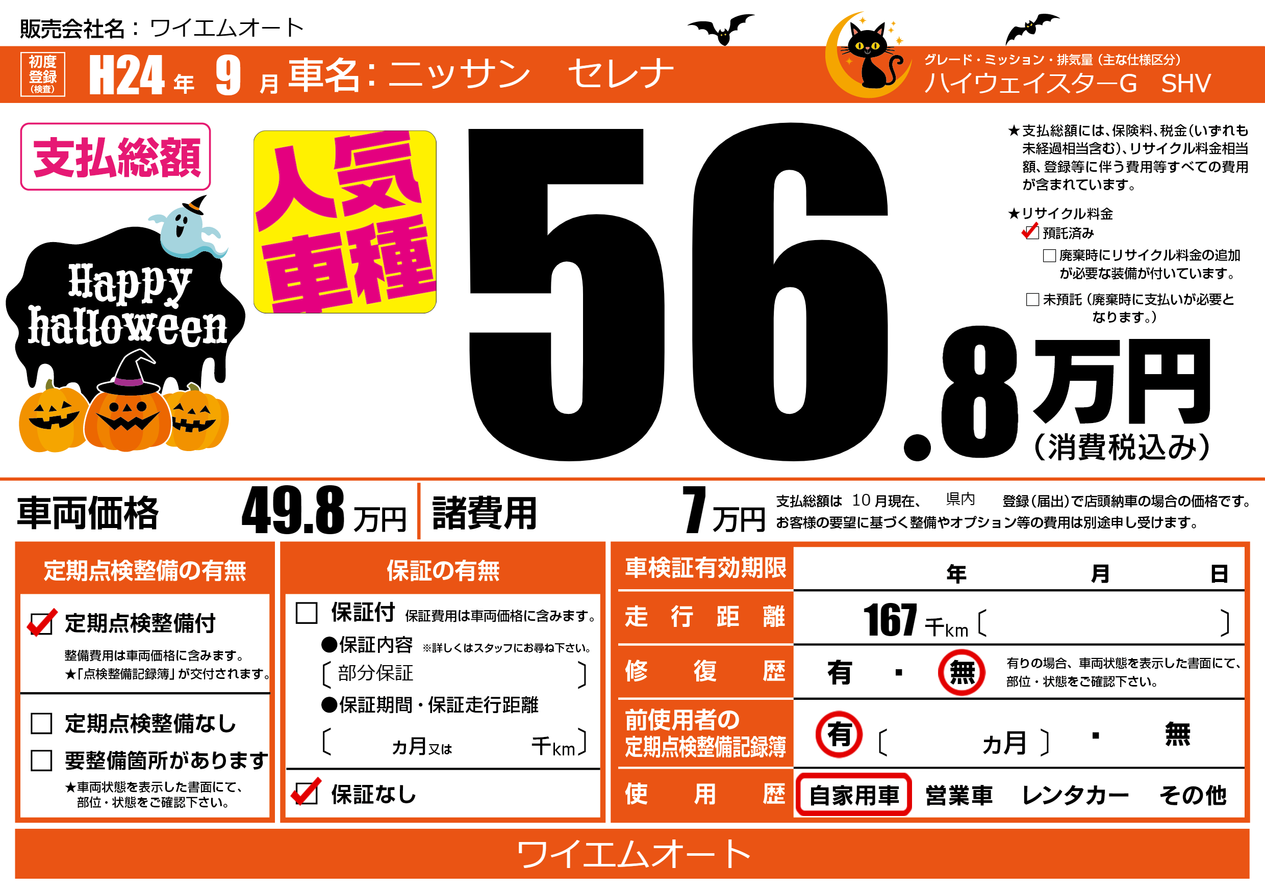 | 走行キロ | 16.7万km | 初年度登録 | H24年9月 |