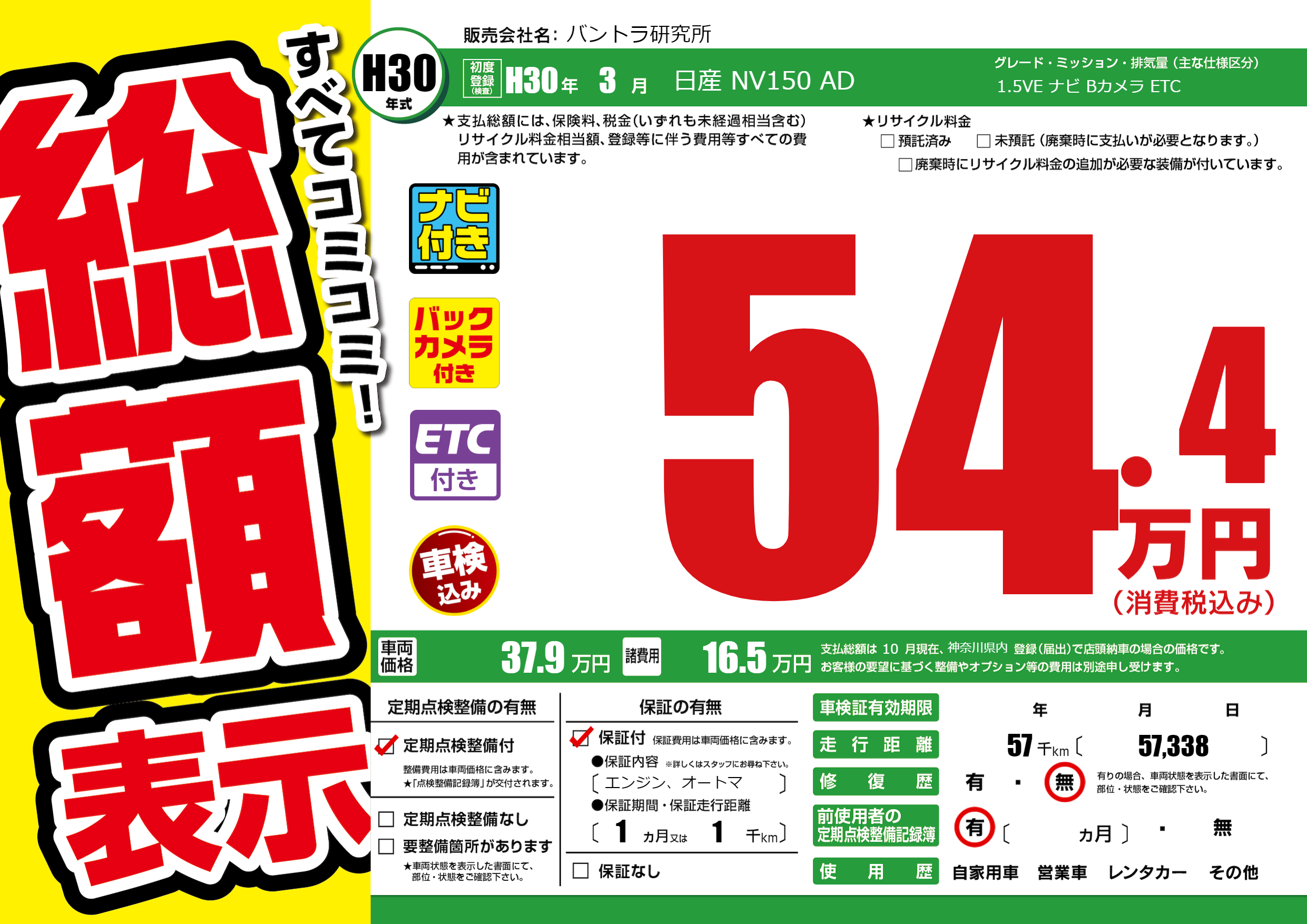 | 車名 | 日産 NV150 AD | グレード ミッション 排気量 |