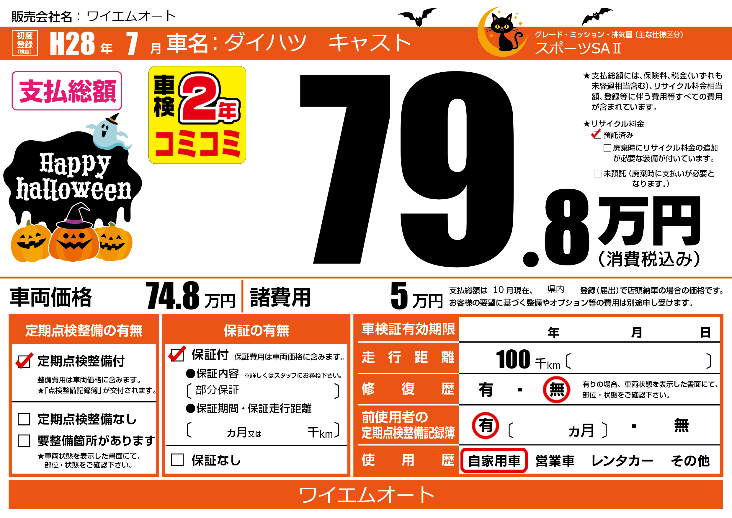 | 走行キロ | 10万km | 初年度登録 | H28年7月 |