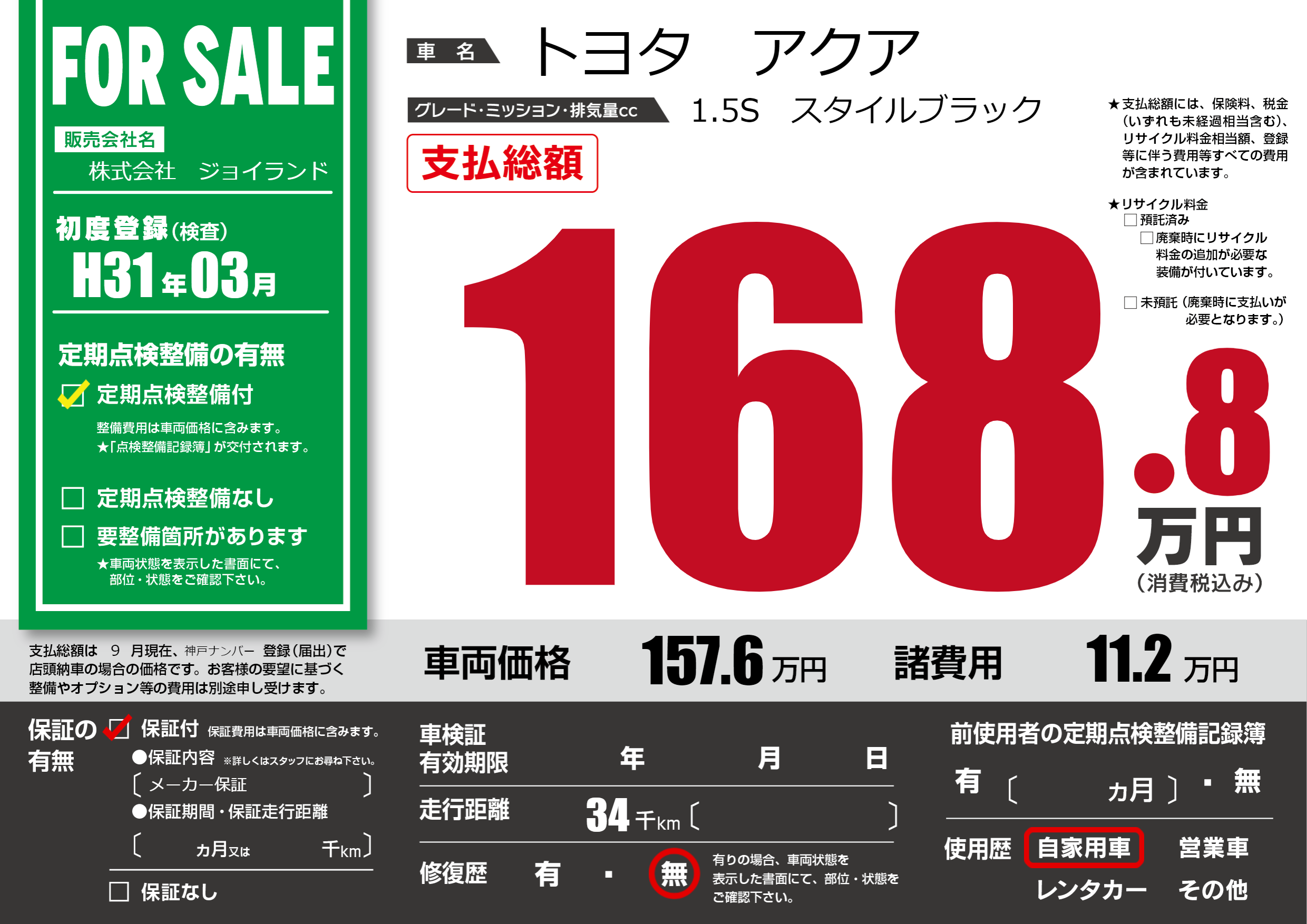 保証付き 保証内容(メーカー保証) ---ヶ月または()千kmまで |