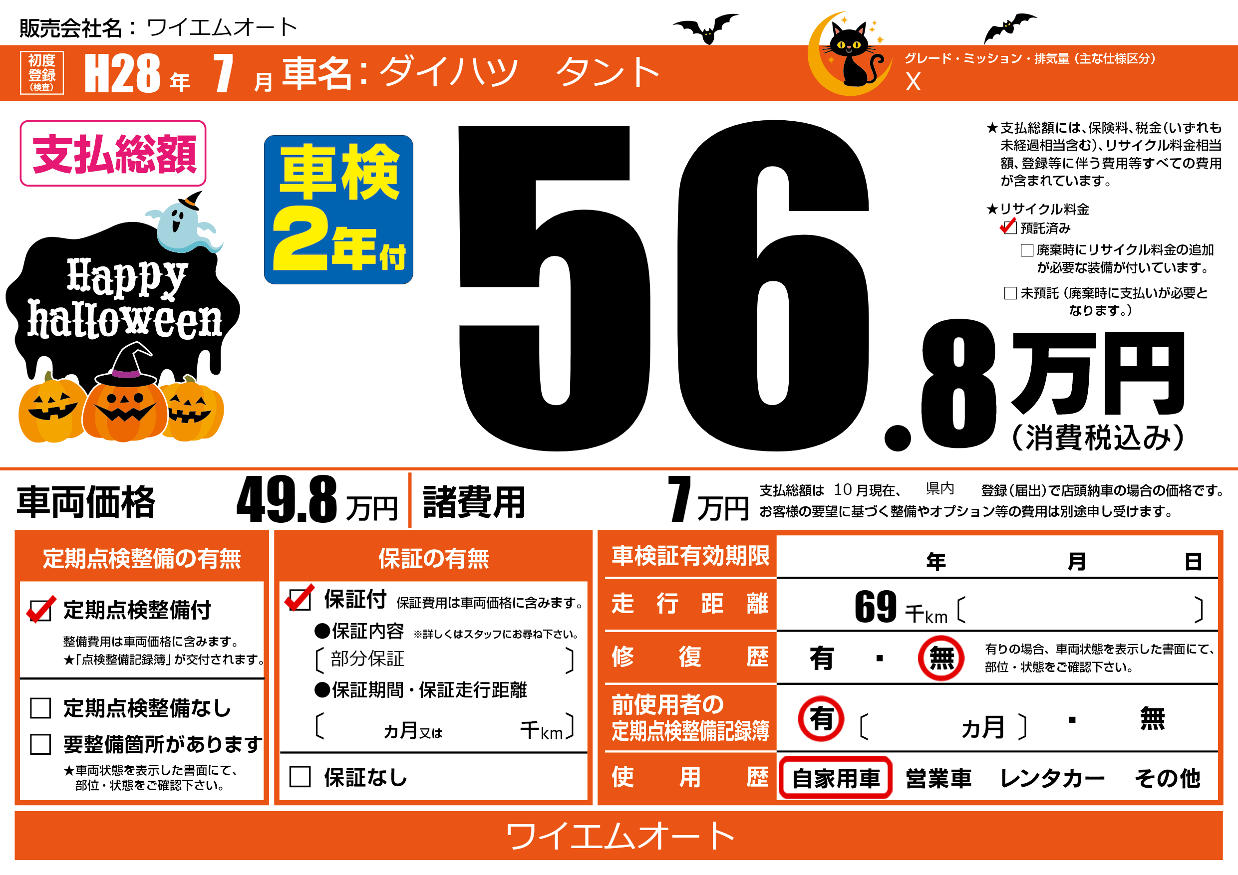 | 走行キロ | 6.9万km | 初年度登録 | H28年7月 |