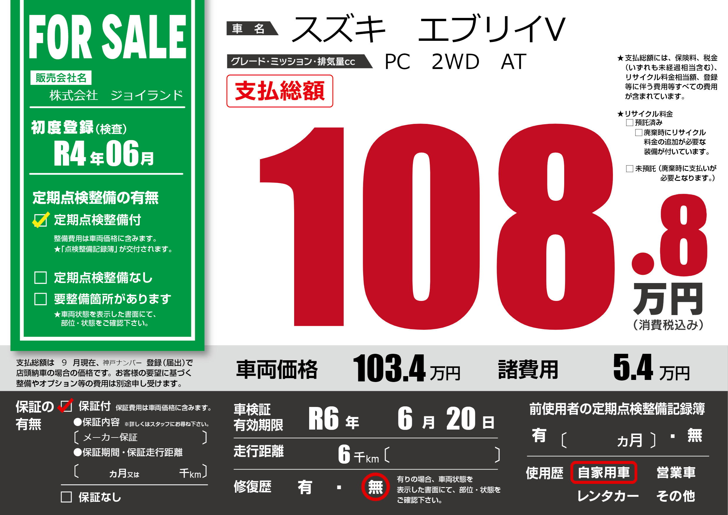 なし | 車検制限 | R6年6月20月 |