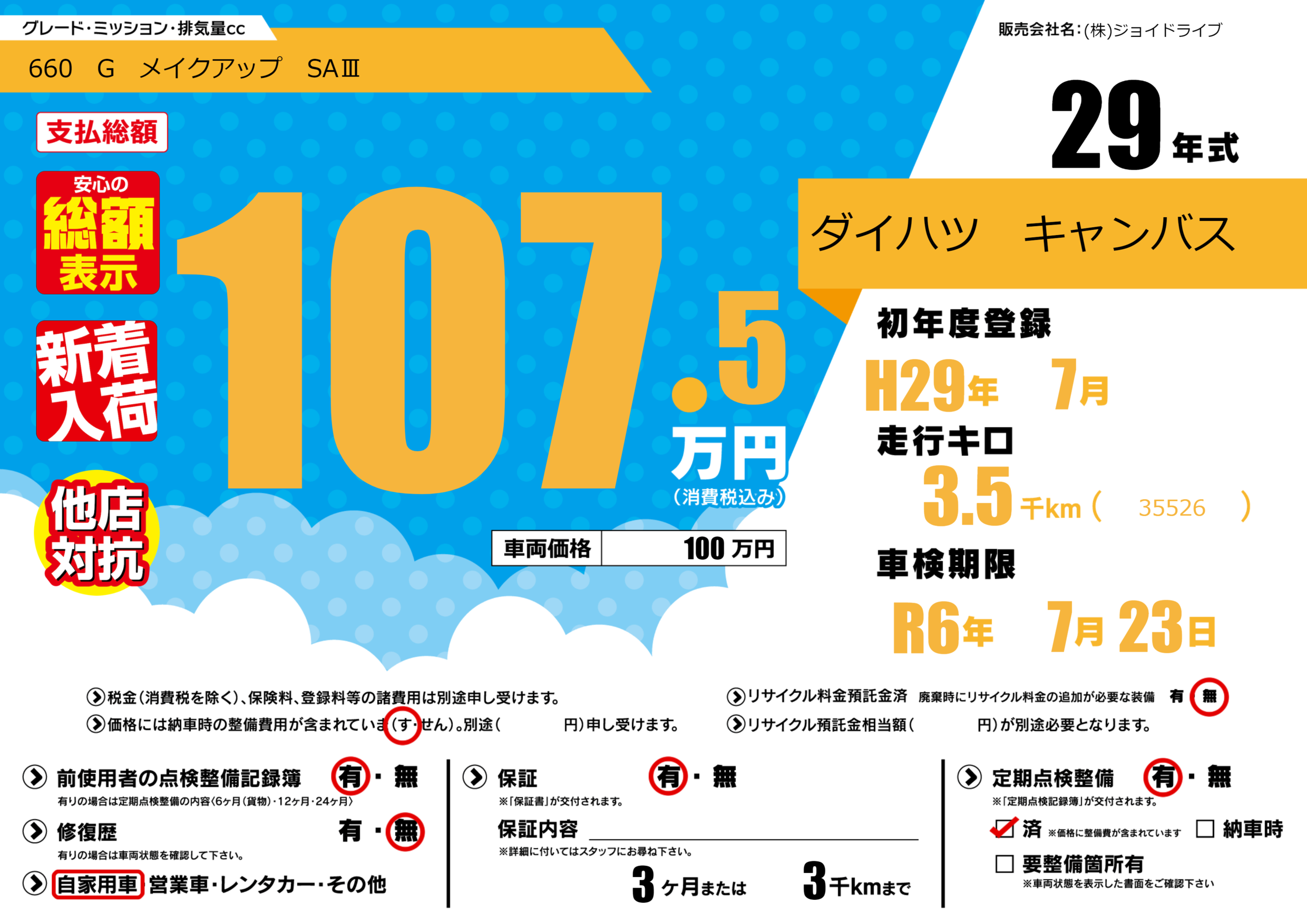 | 車名 | ダイハツ キャンバス | グレード ミッション 排気量 |