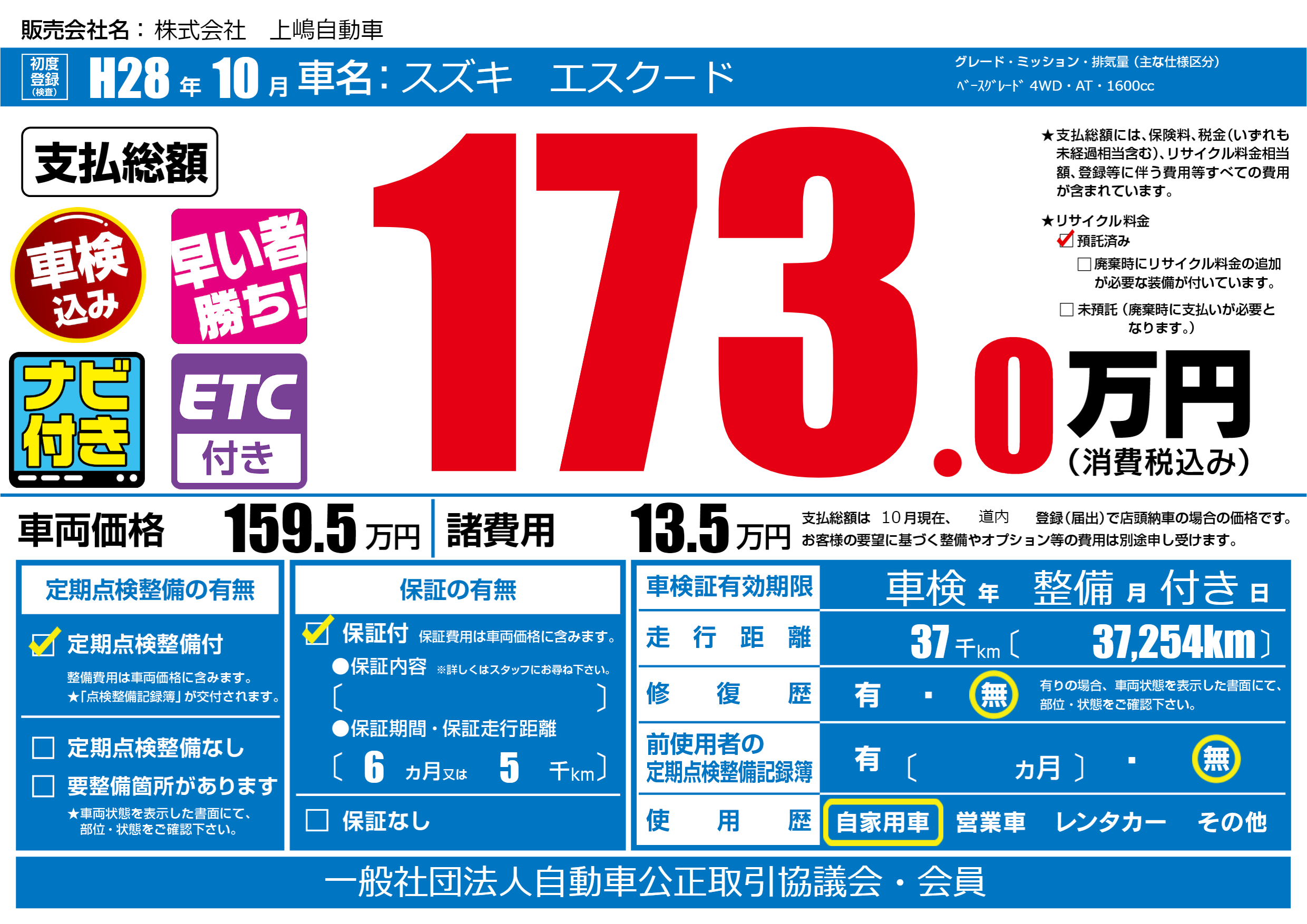 | 車名 | スズキ エスクード | グレード ミッション 排気量 |