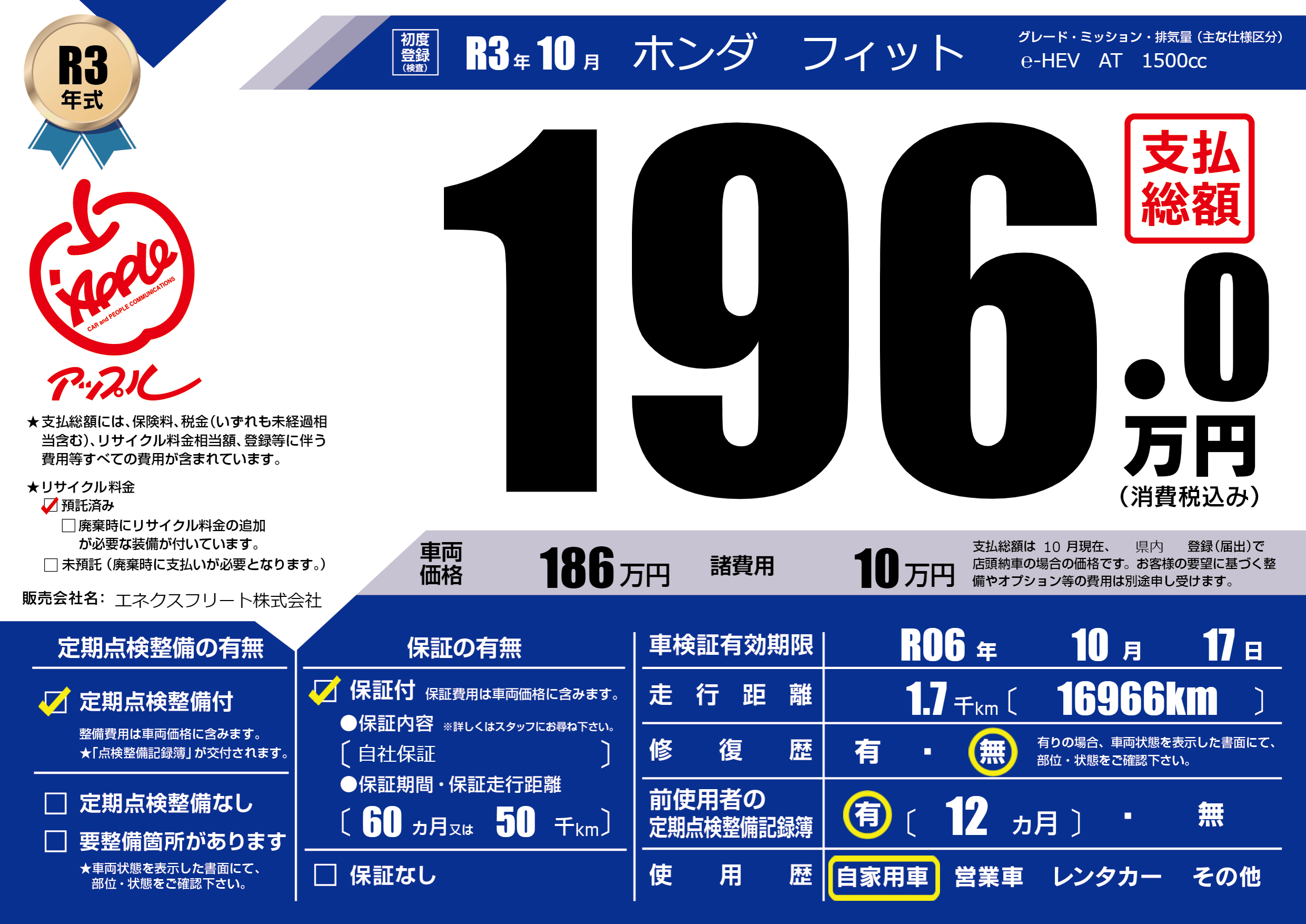 | 走行キロ | 0.1万km | 初年度登録 | R3年10月 |