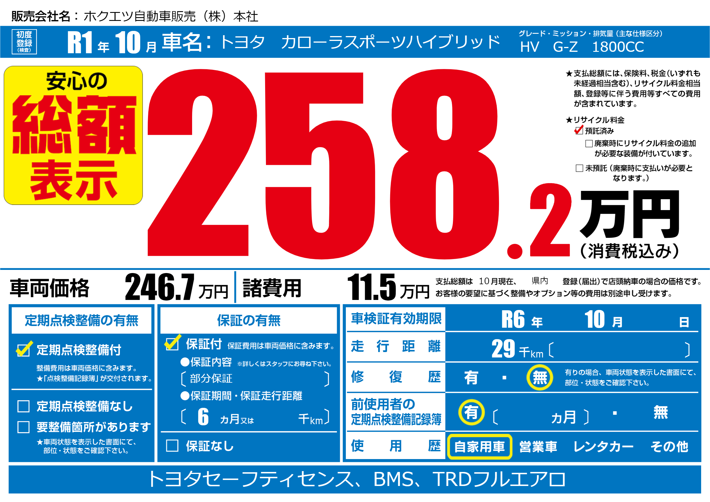 | 車名 | トヨタ カローラスポーツハイブリッド | グレード ミッション 排気量 |