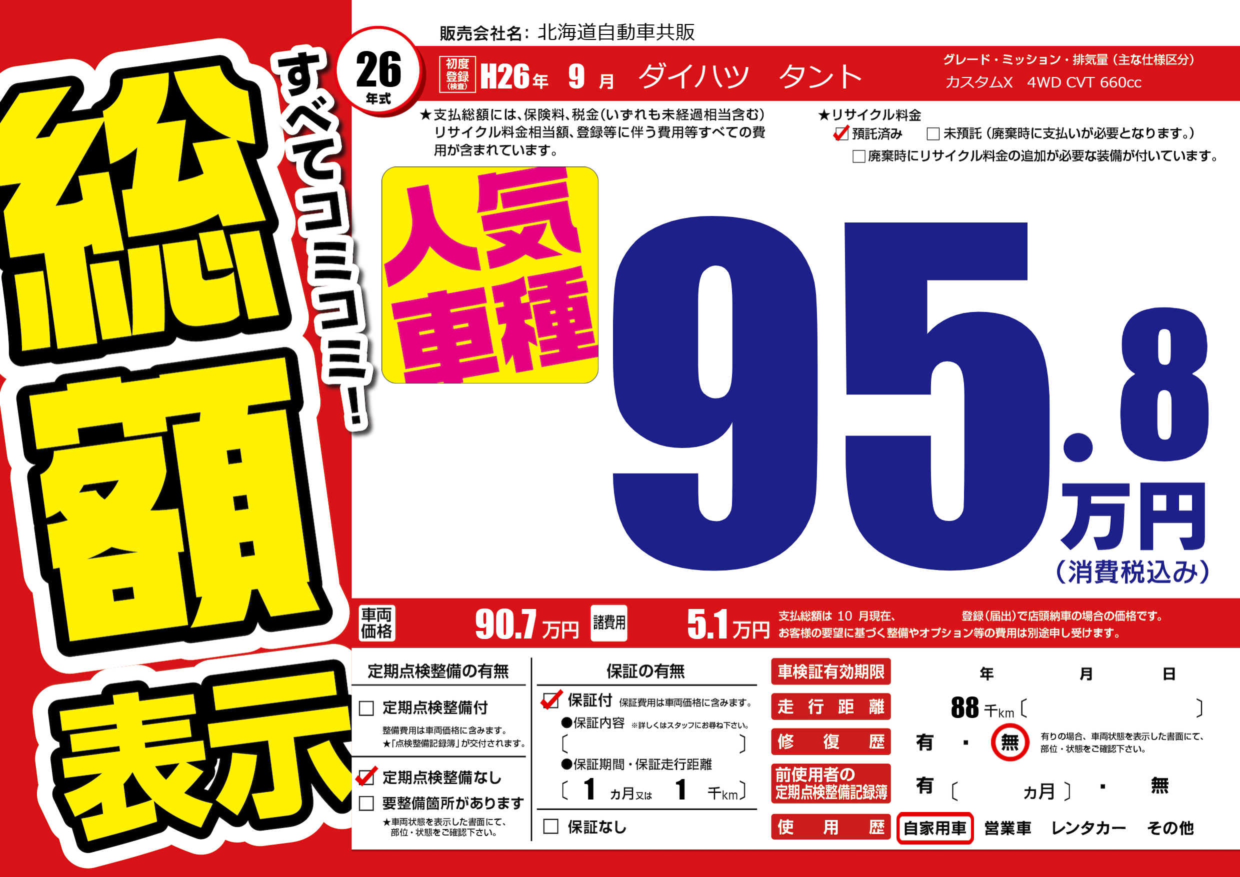| 車名 | ダイハツ タント | グレード ミッション 排気量 |