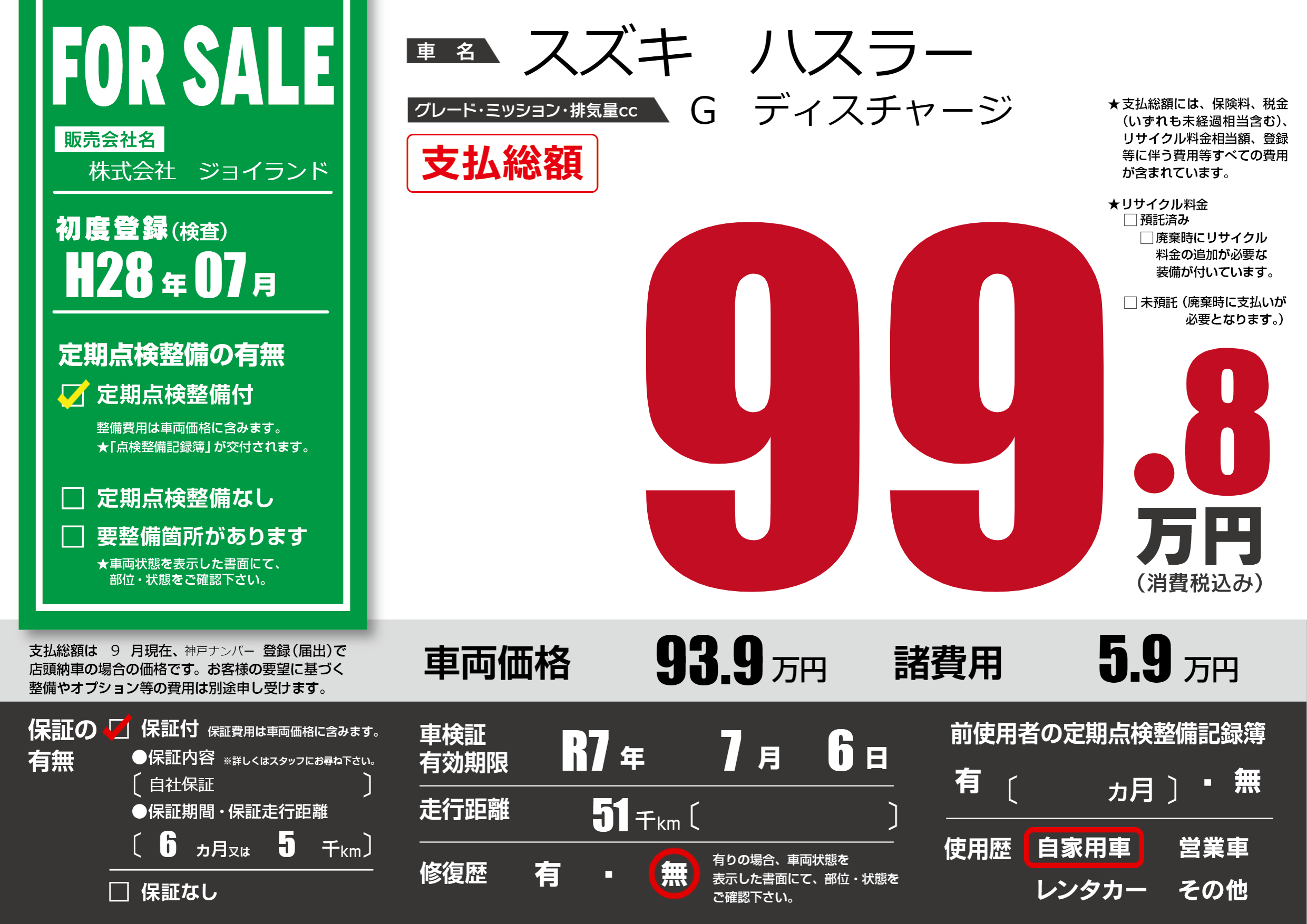 保証付き 保証内容(自社保証) 6ヶ月または5千km |
