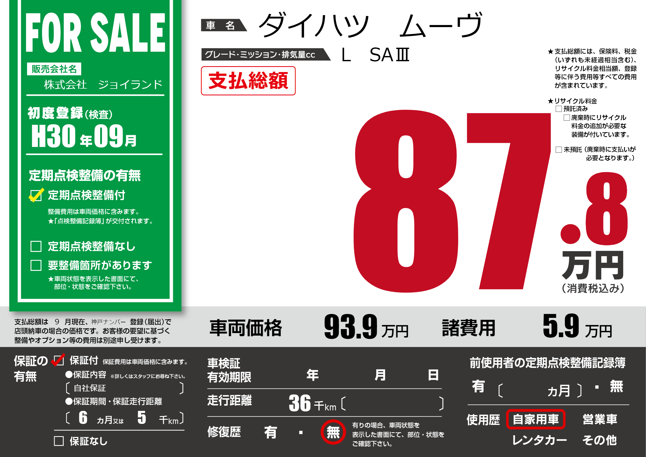 | 車名 | ダイハツ ムーヴ | グレード ミッション 排気量 |