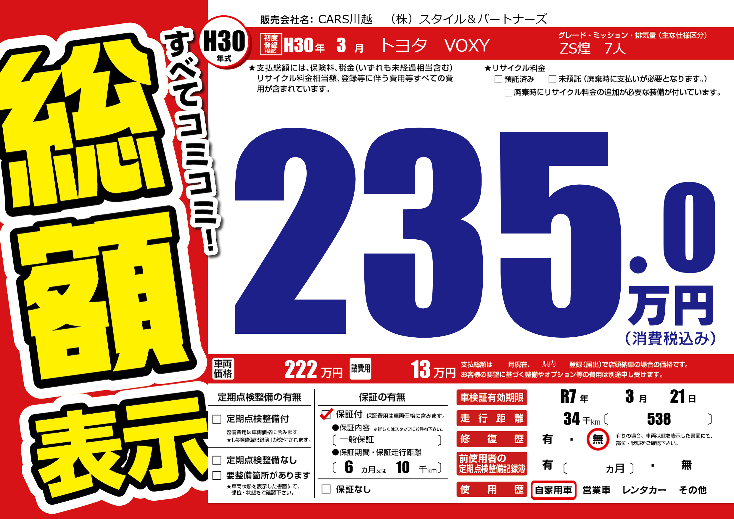 | 車名 | トヨタ VOXY | グレード ミッション 排気量 |