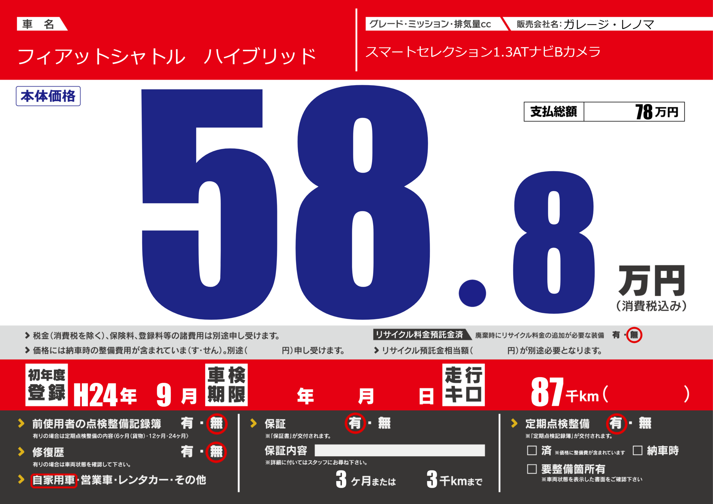 | 車名 | フィアットシャトル ハイブリッド | グレード ミッション 排気量 |