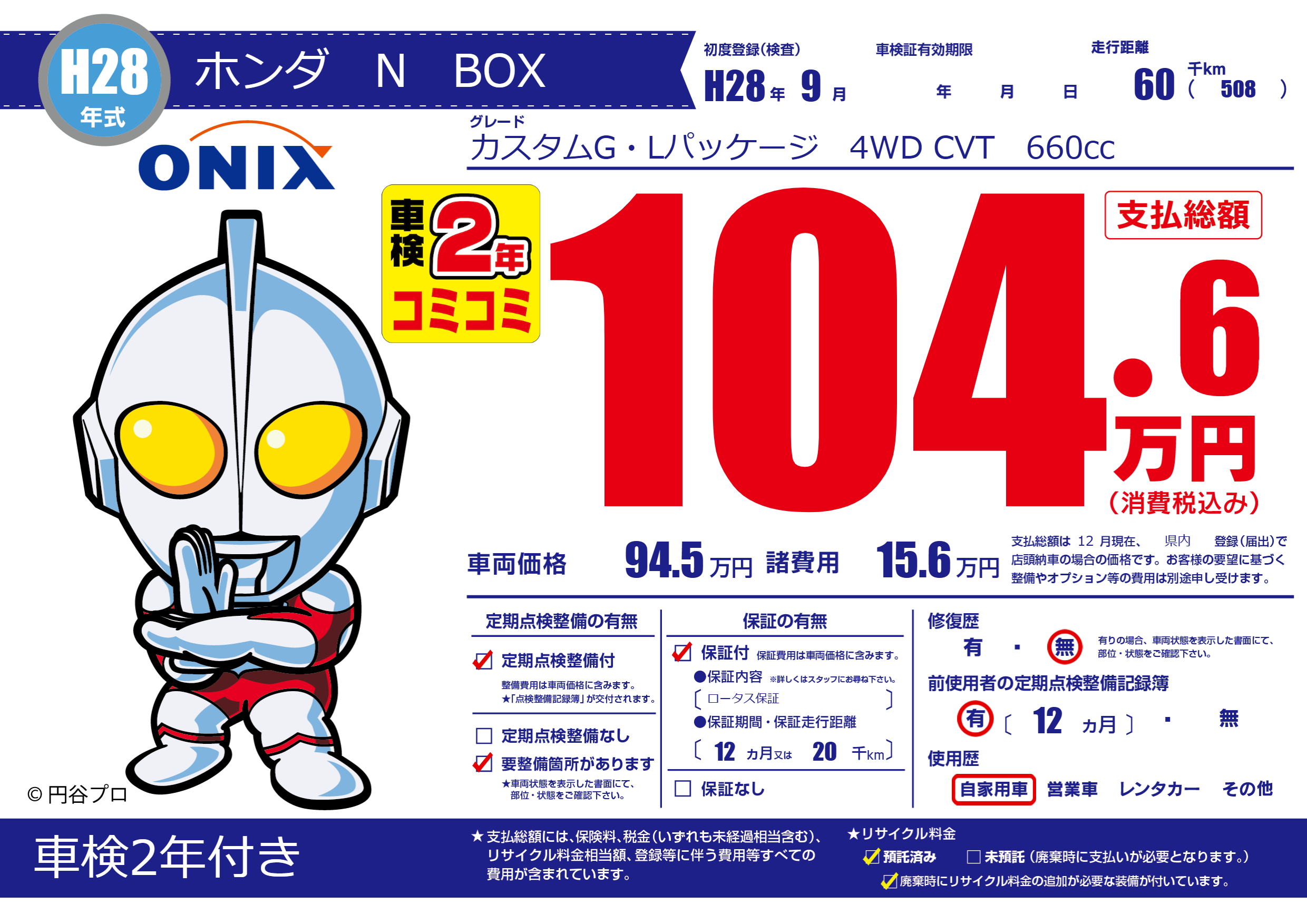 | 走行キロ | 6万km | 初年度登録 | H28年9月 |