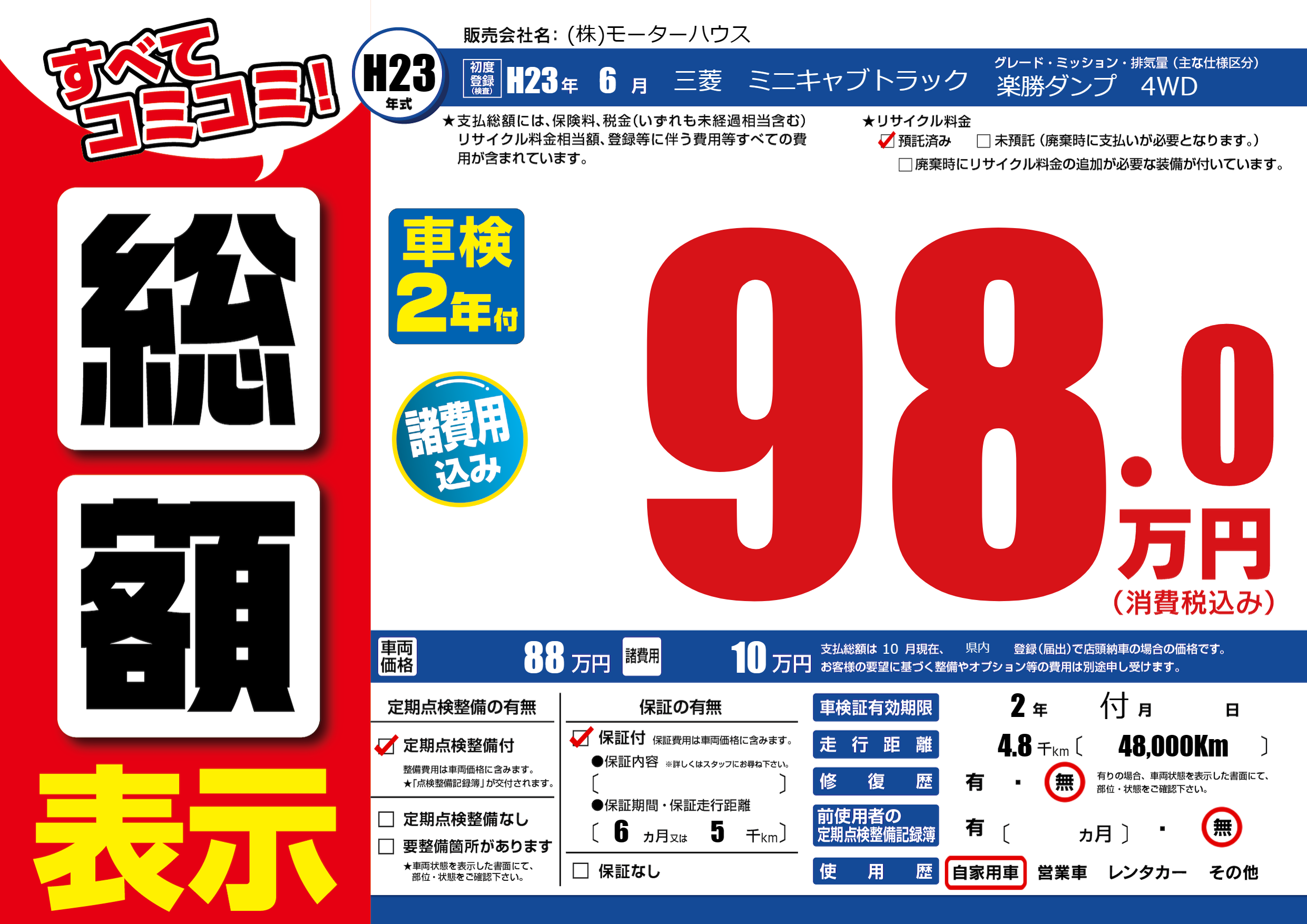 | 走行キロ | 0.4万km | 初年度登録 | H23年6月 |