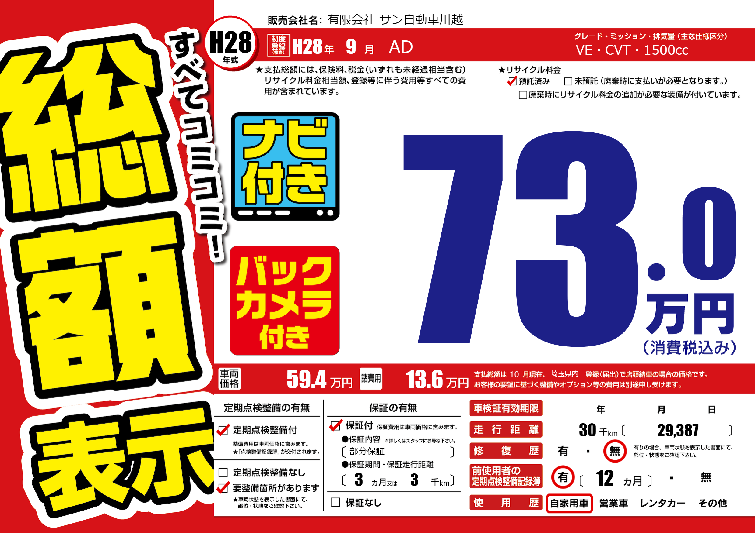 | 走行キロ | 3万km | 初年度登録 | H28年9月 |