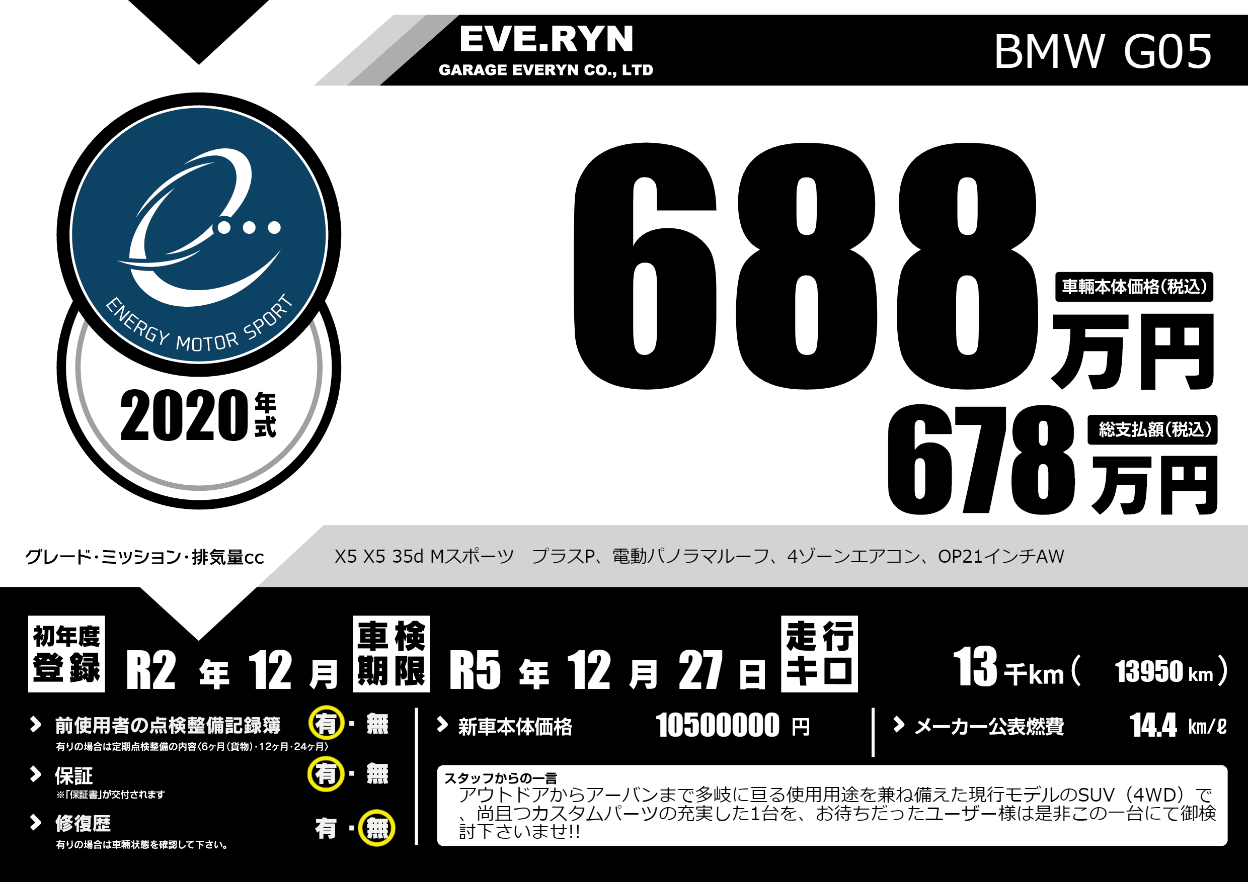 | 車名 | BMW G05 | グレード ミッション 排気量 |