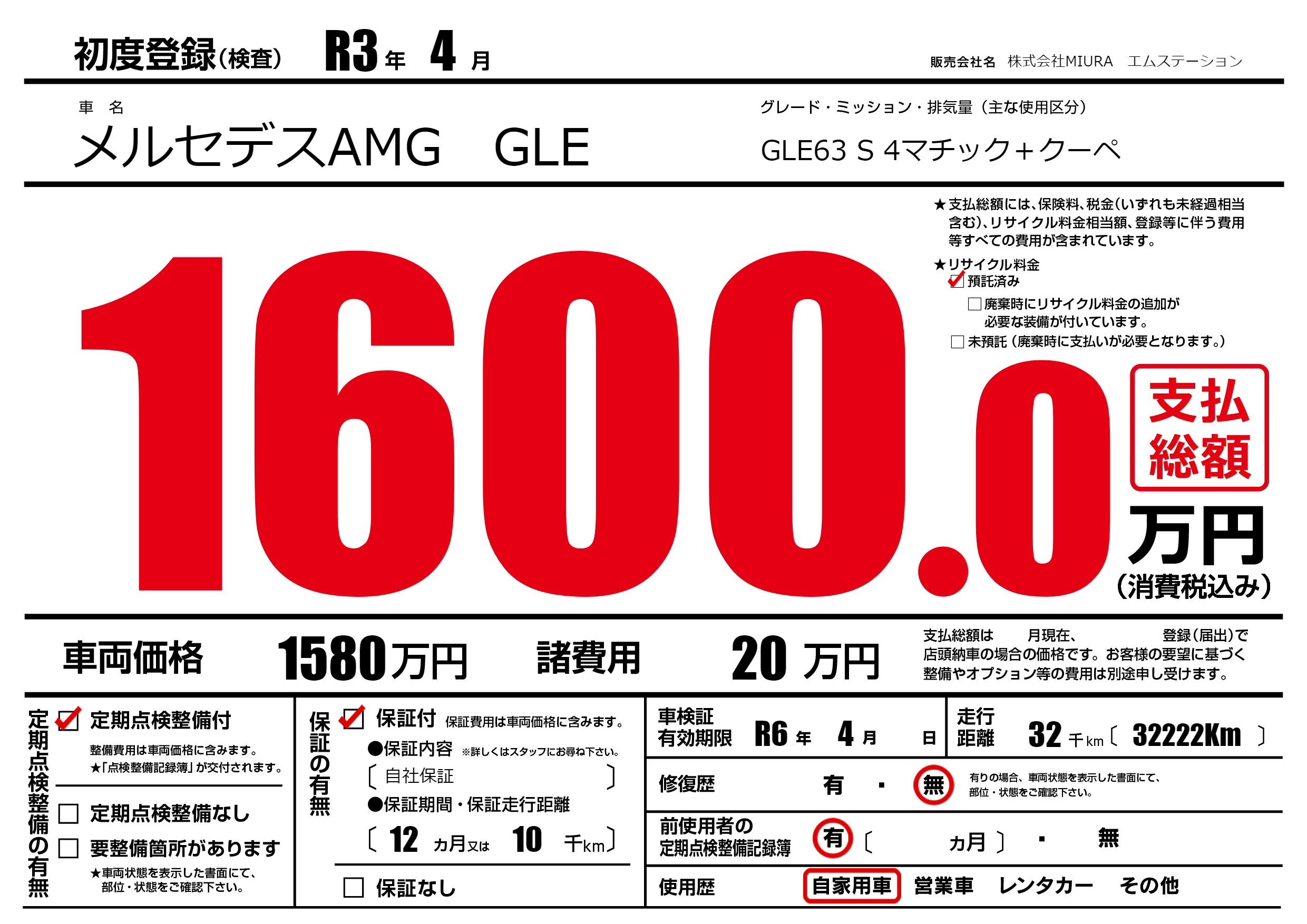 | 車名 | メルセデスAMG GLE | グレード ミッション 排気量 |