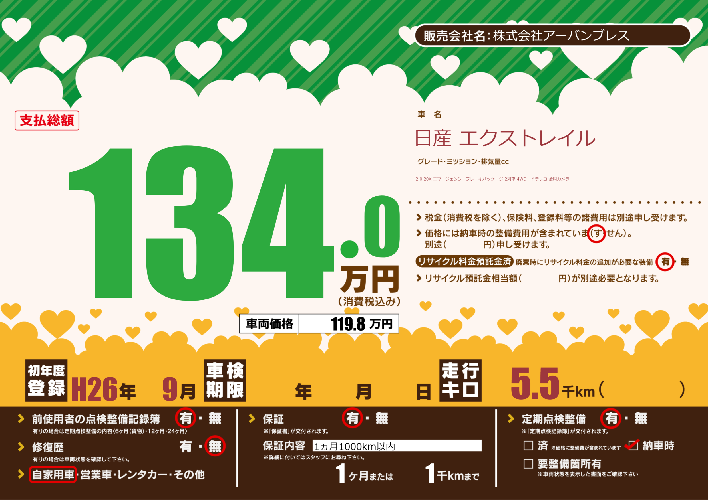 | 定期点検整備 | 定期点検整備あり 納車時あり | ||