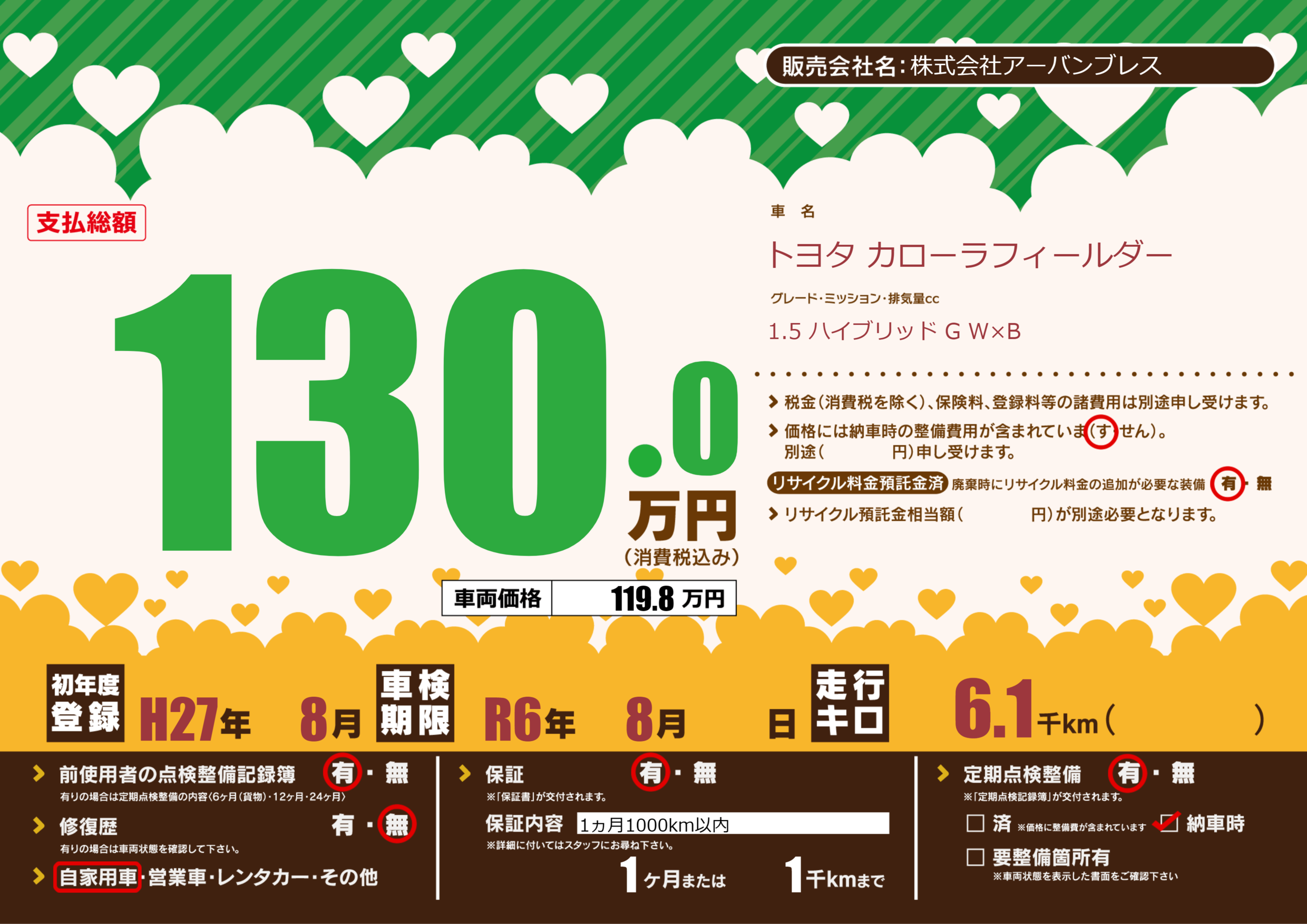 | 走行キロ | 0.6万km | 初年度登録 | H27年8月 |