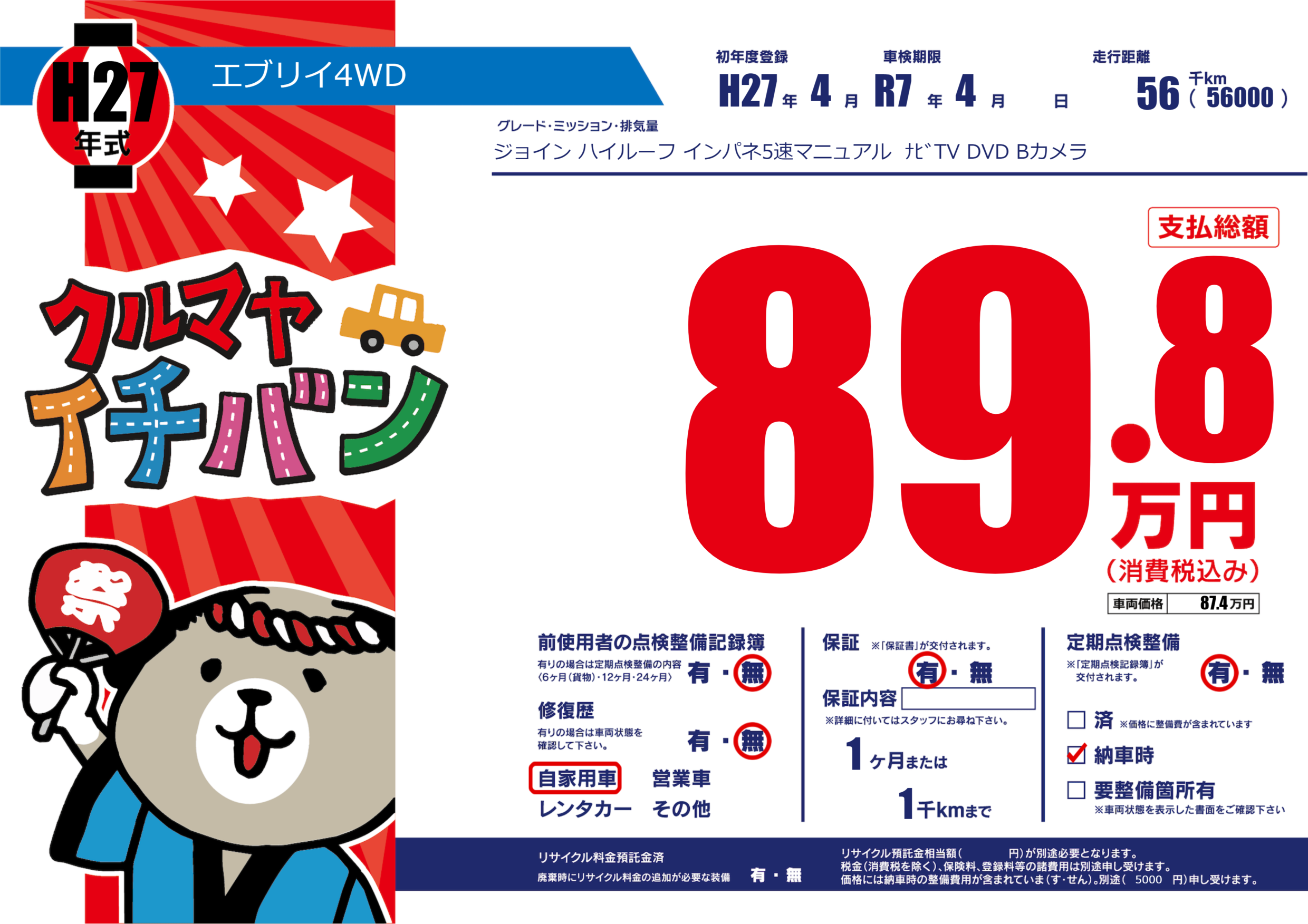 | 車名 | エブリイ4WD | グレード ミッション 排気量 |