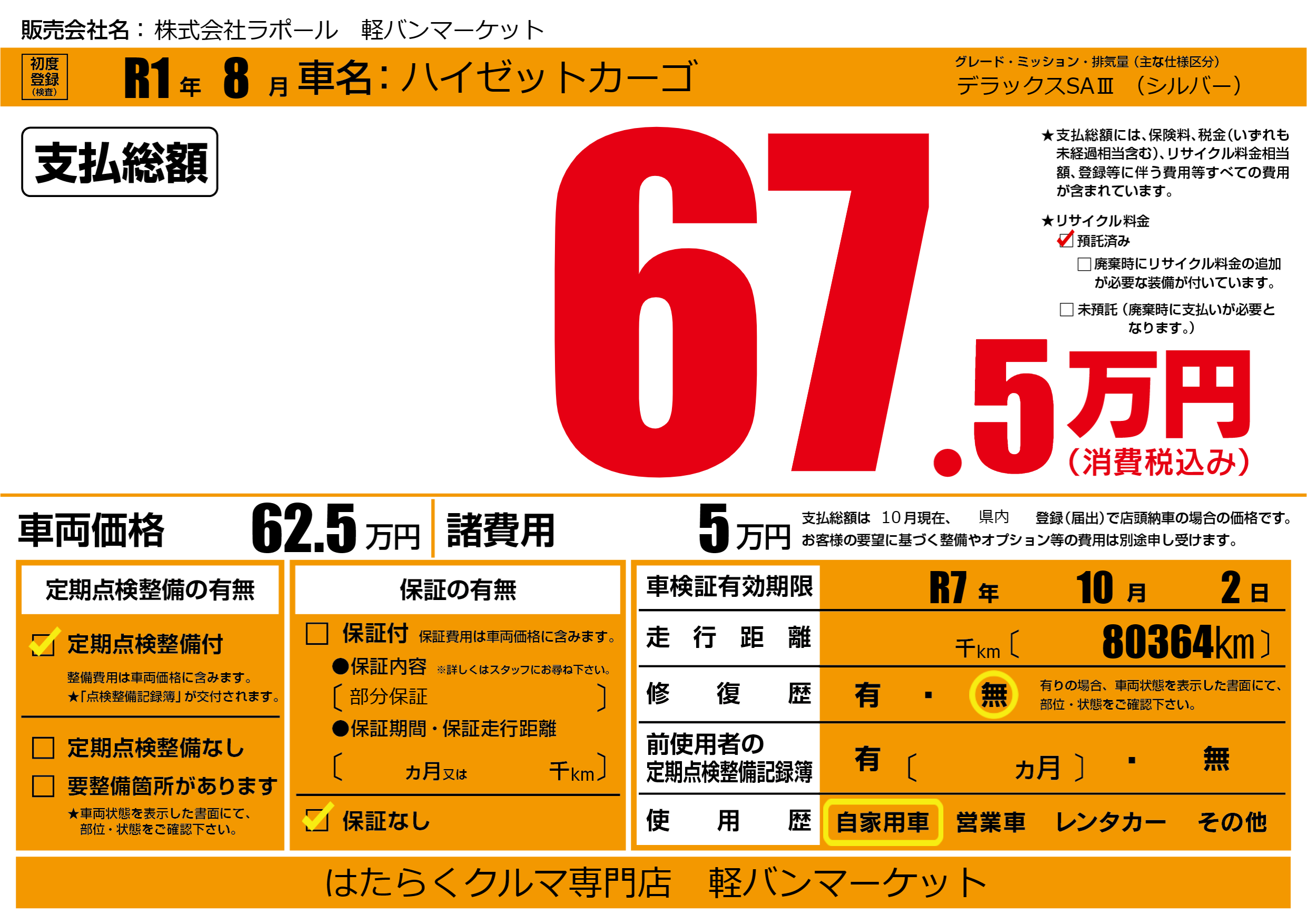 なし | 車検制限 | R7年10月2月 |
