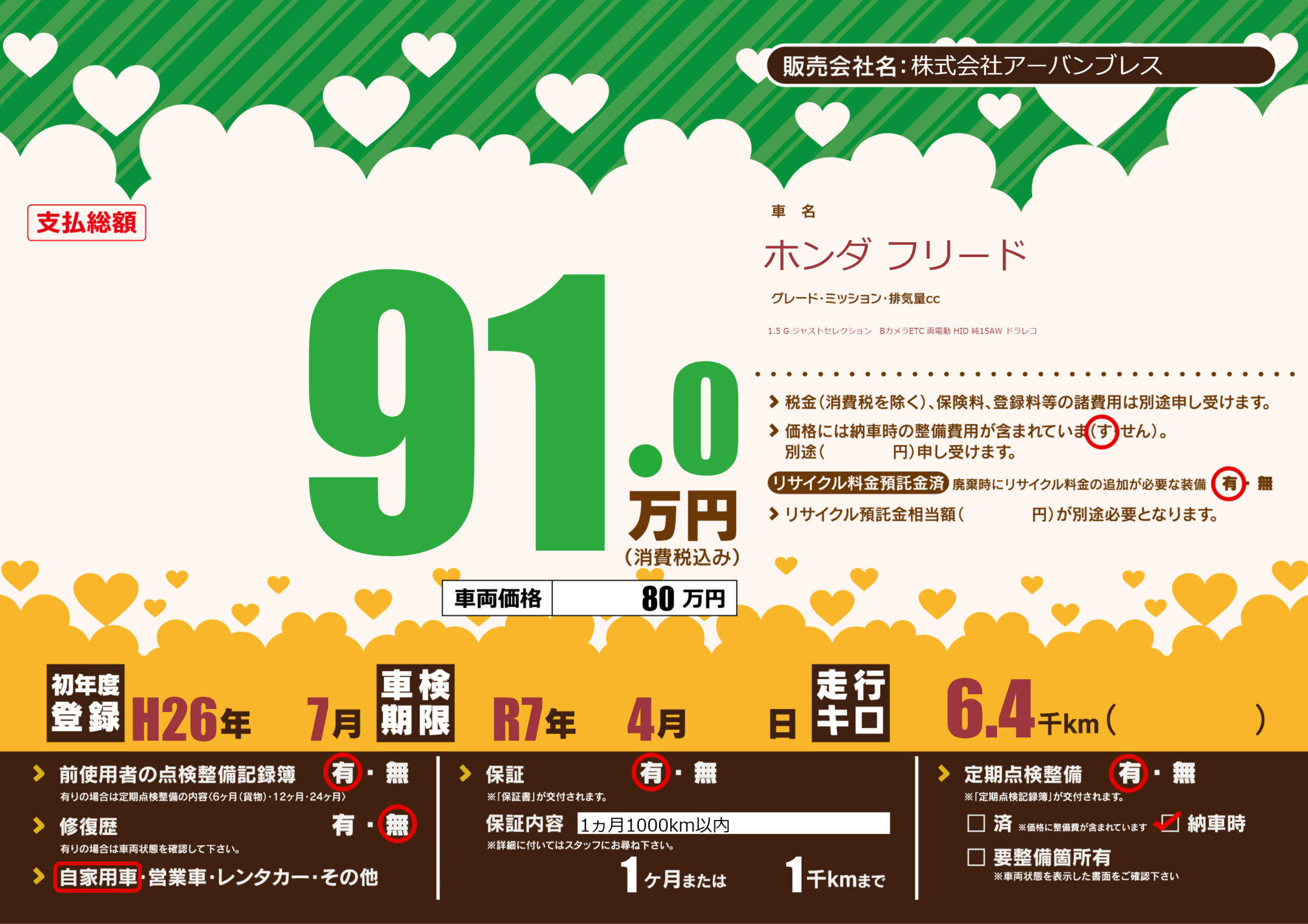 | 車名 | ホンダ フリード | グレード ミッション 排気量 |