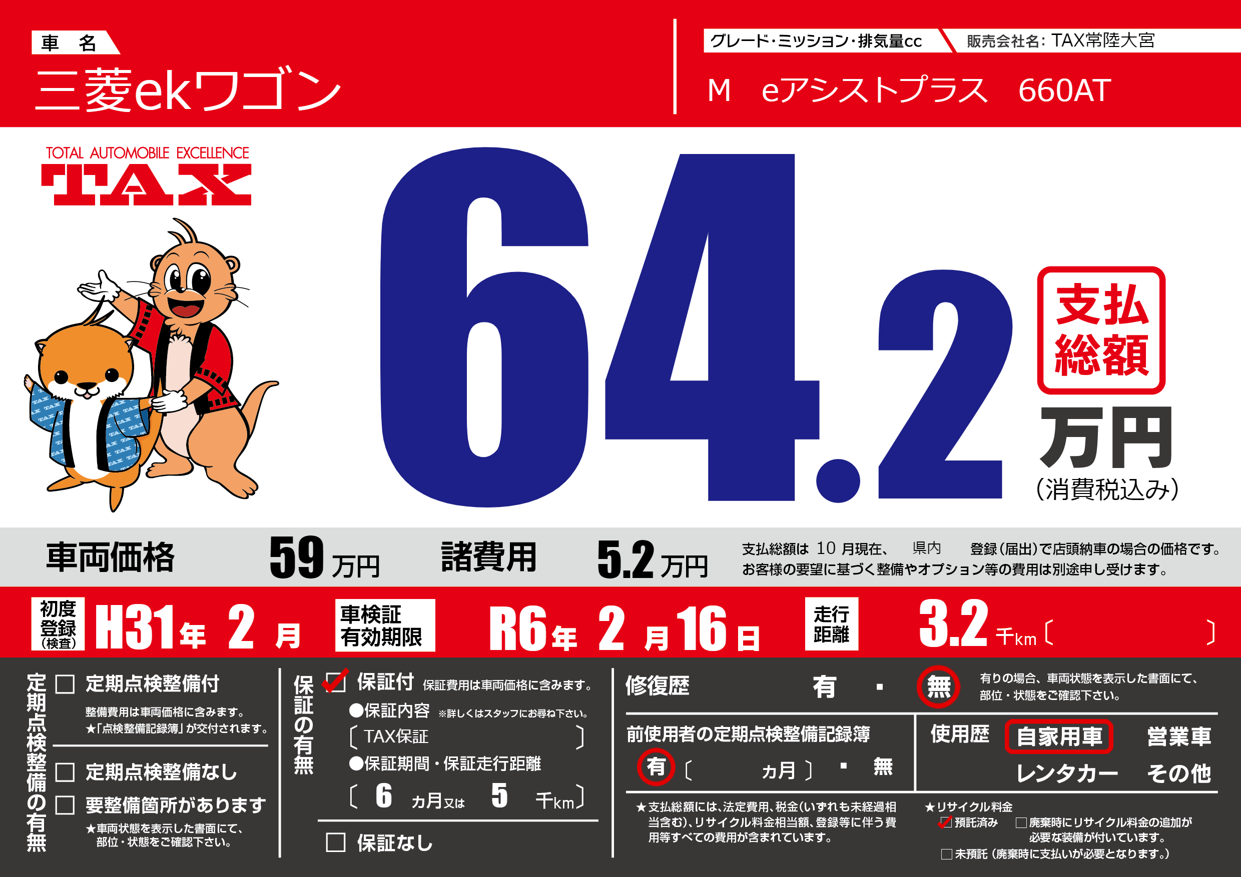 保証付き 保証内容(TAX保証) 6ヶ月または(5)千kmまで |