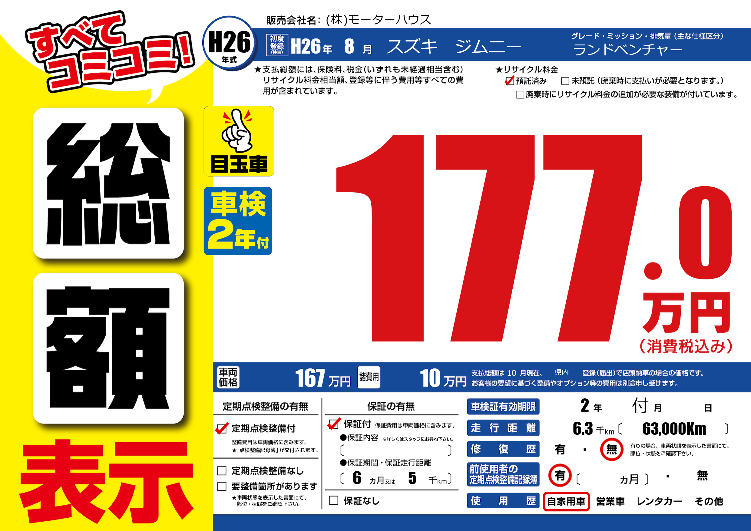 | 車名 | スズキ ジムニー | グレード ミッション 排気量 |