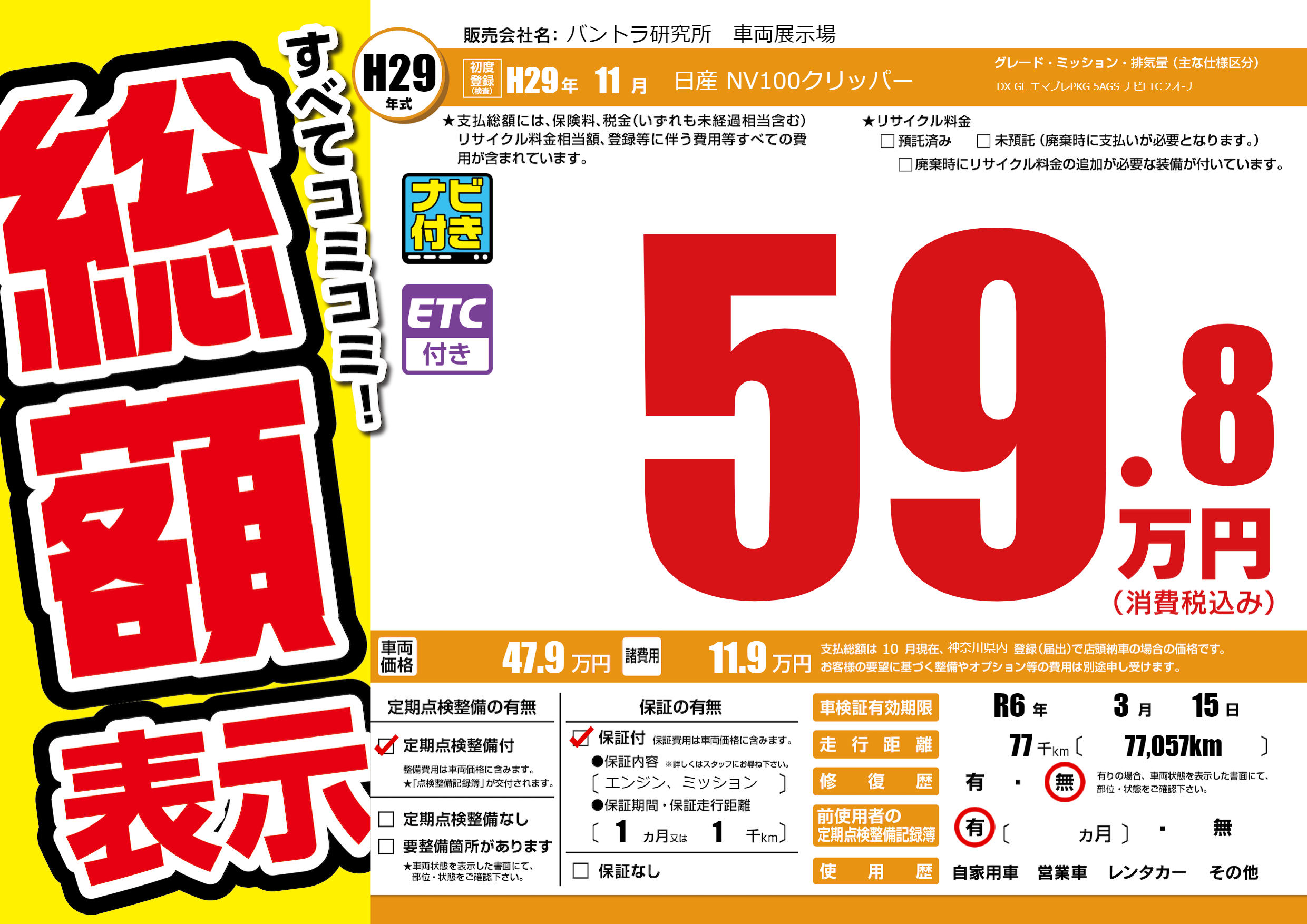 | 車名 | 日産 NV100クリッパー | グレード ミッション 排気量 |