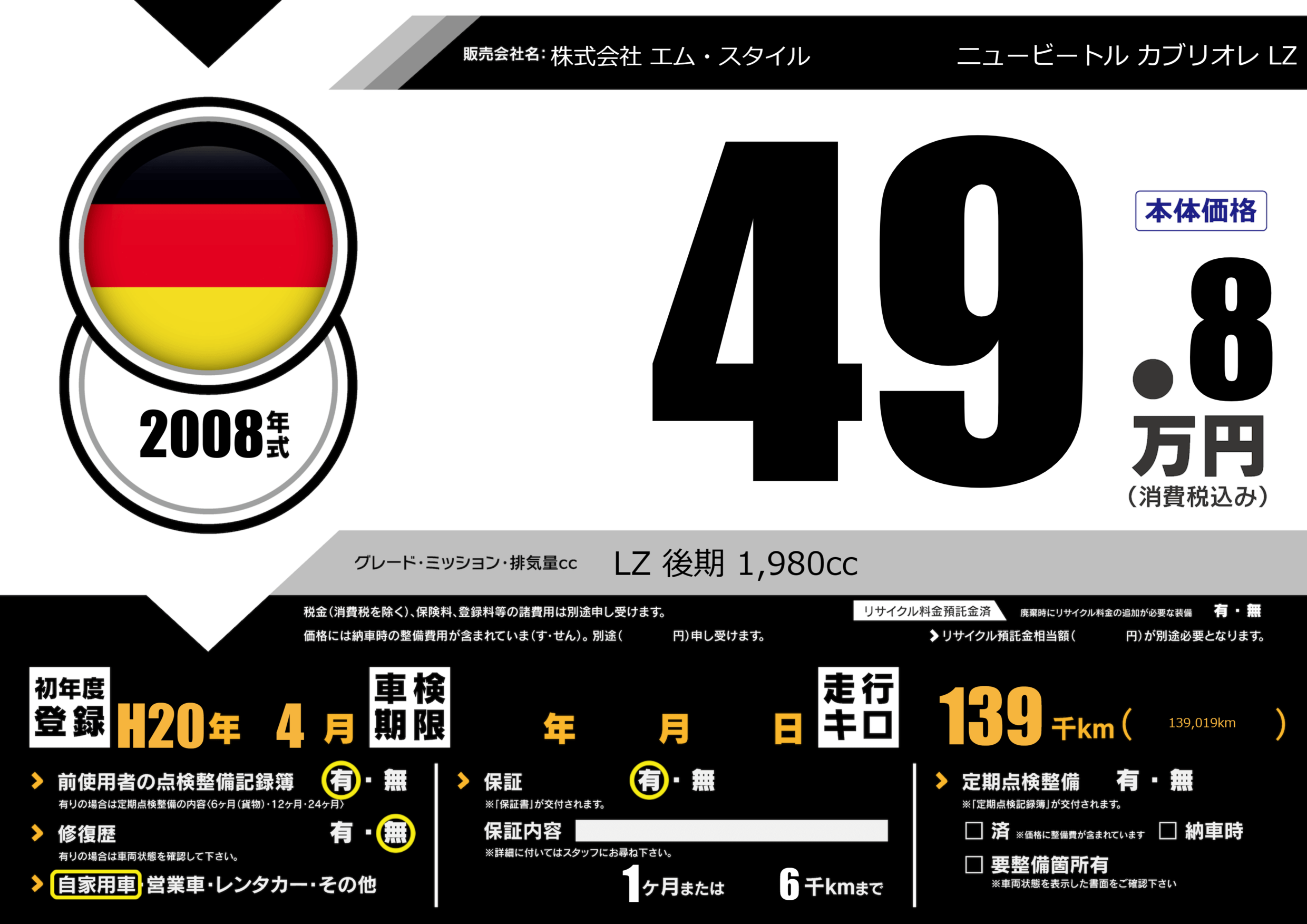 | 車名 | ニュービートル カブリオレ LZ | グレード ミッション 排気量 |