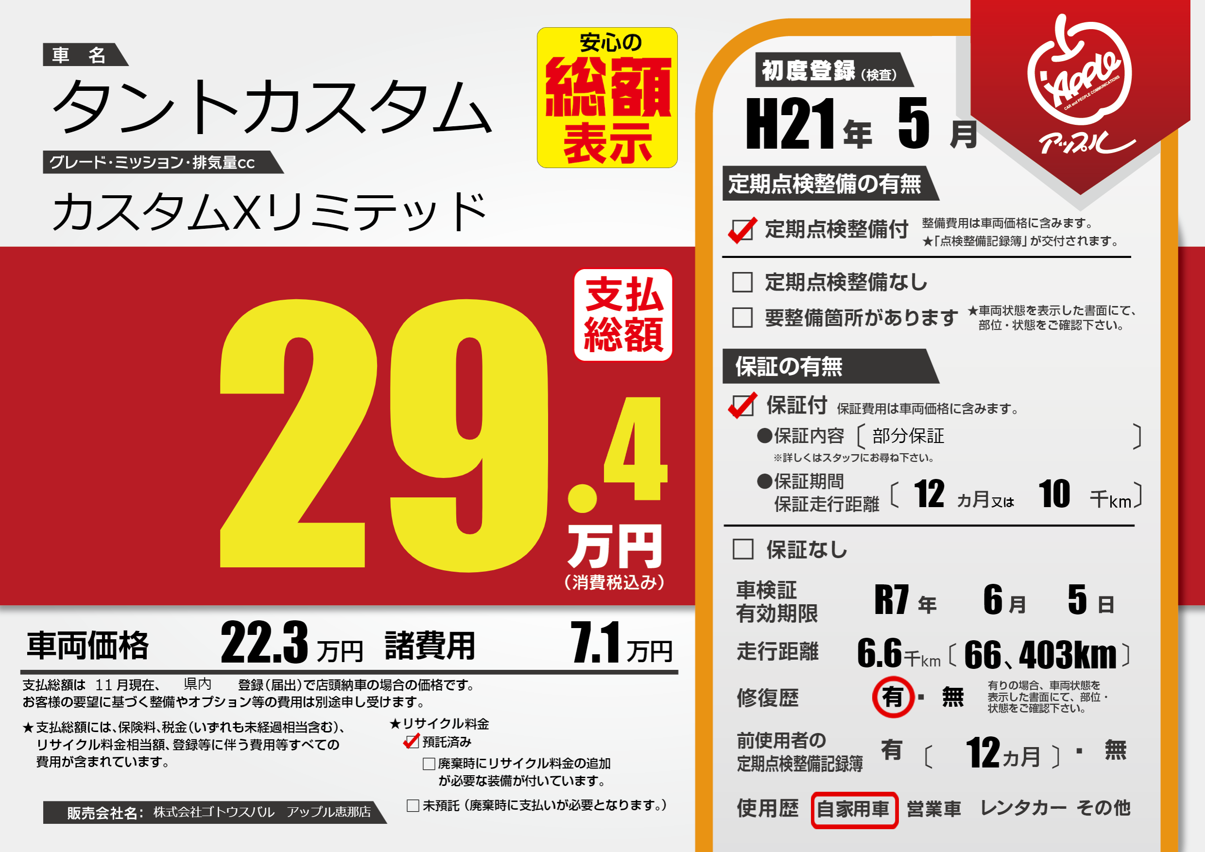 | 車名 | タントカスタム | グレード ミッション 排気量 |