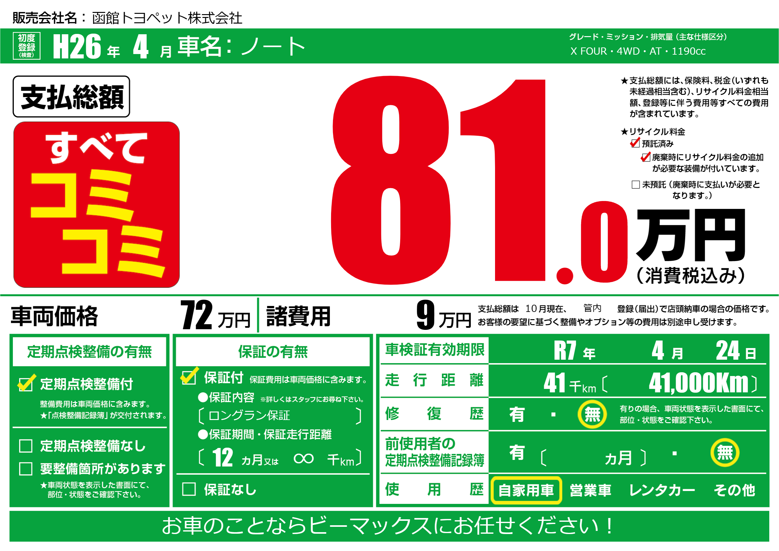 | 走行キロ | 4.1万km | 初年度登録 | H26年4月 |