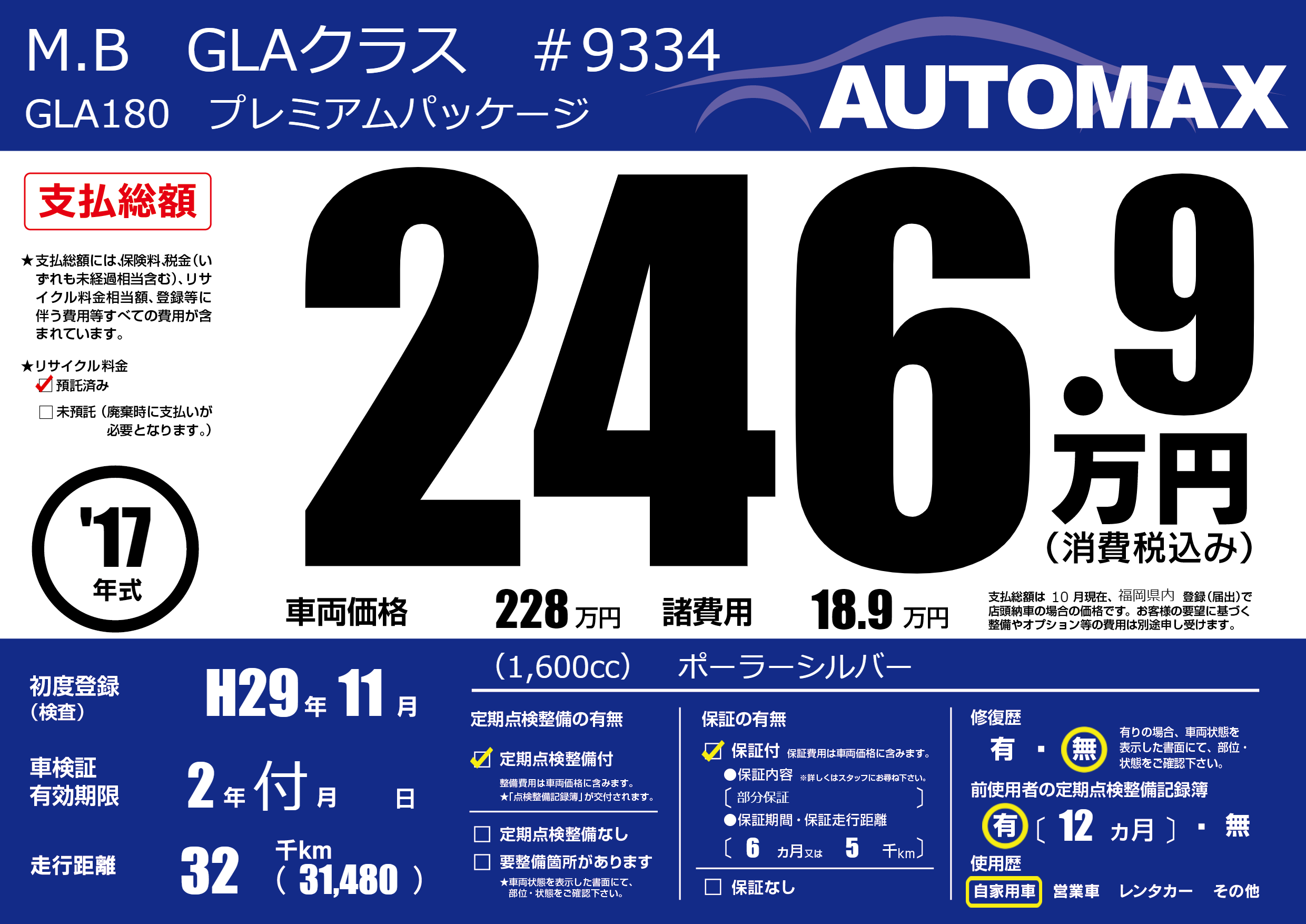 | 車名 | M.B GLAクラス #9334 | グレード ミッション 排気量 |