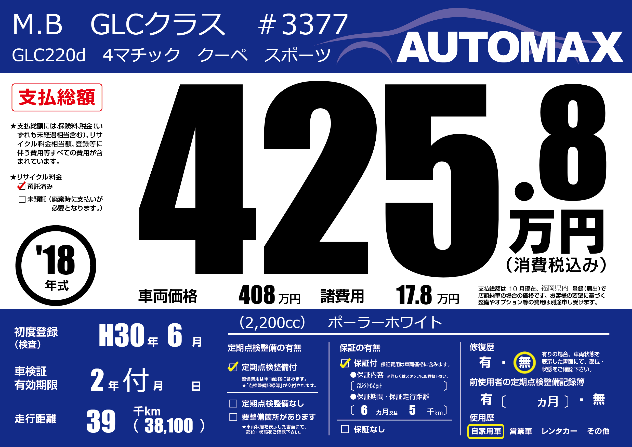 | 車名 | M.B GLCクラス #3377 | グレード ミッション 排気量 |