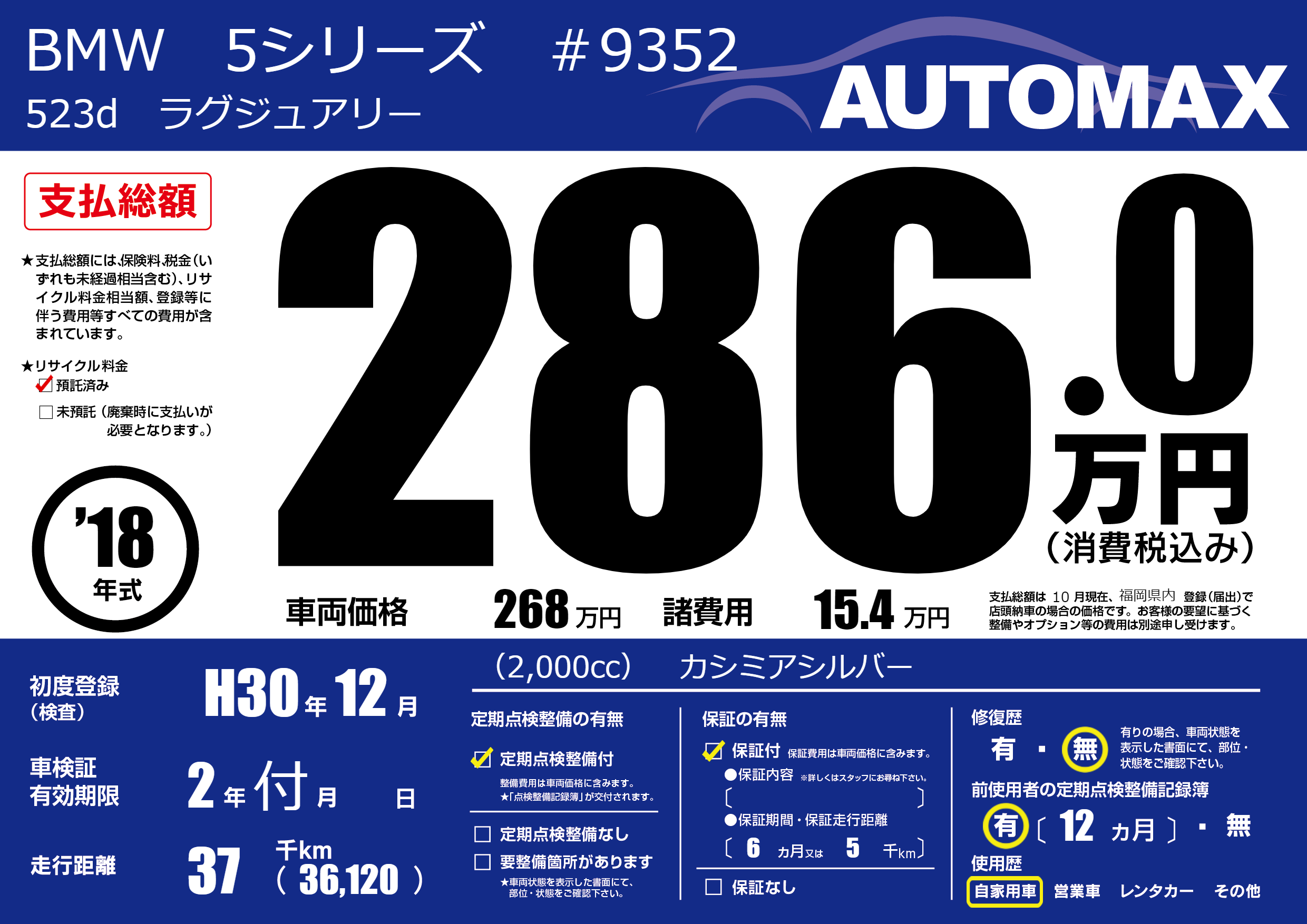 | 車名 | BMW 5シリーズ #9352 | グレード ミッション 排気量 |