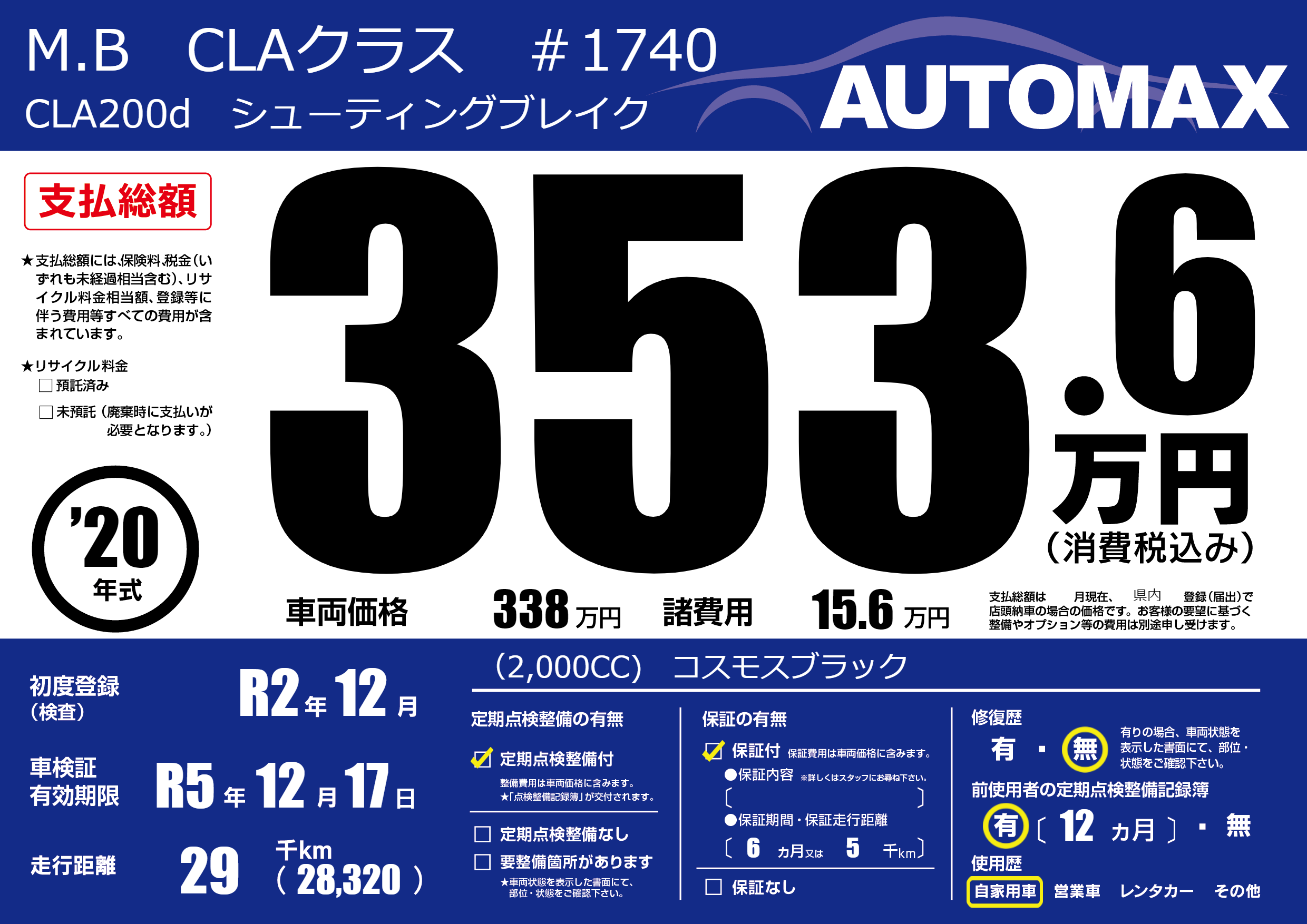 | 車名 | M.B CLAクラス #1740 | グレード ミッション 排気量 |