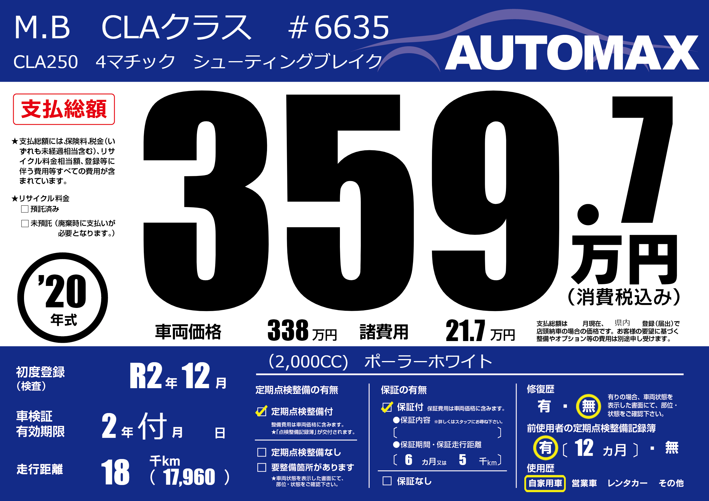 | 車名 | M.B CLAクラス #6635 | グレード ミッション 排気量 |
