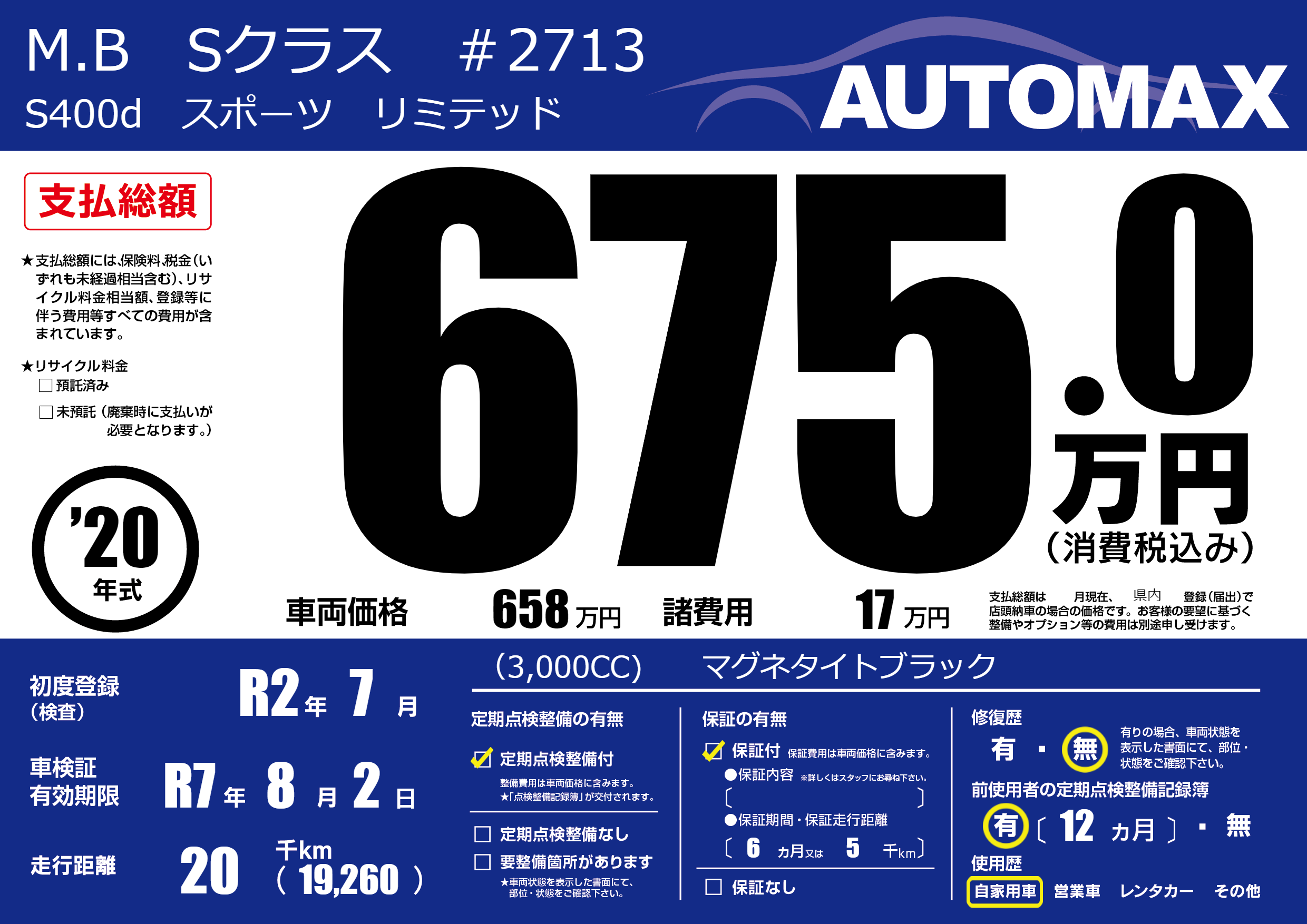 | 車名 | M.B Sクラス #2713 | グレード ミッション 排気量 |