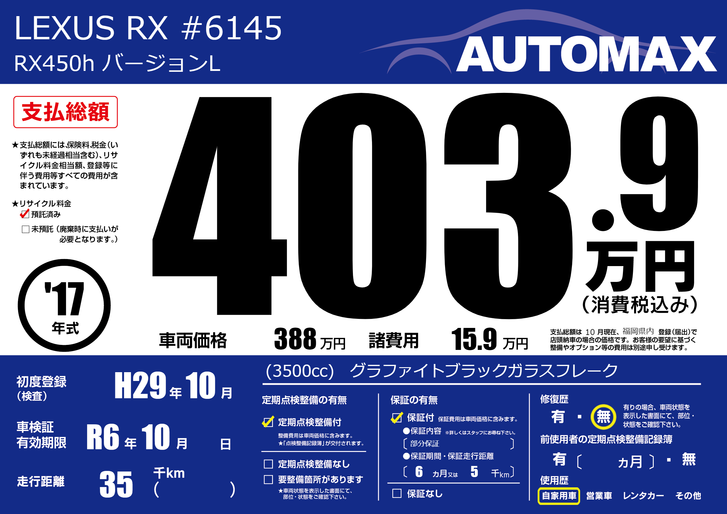 | 車名 | LEXUS RX #6145 | グレード ミッション 排気量 |