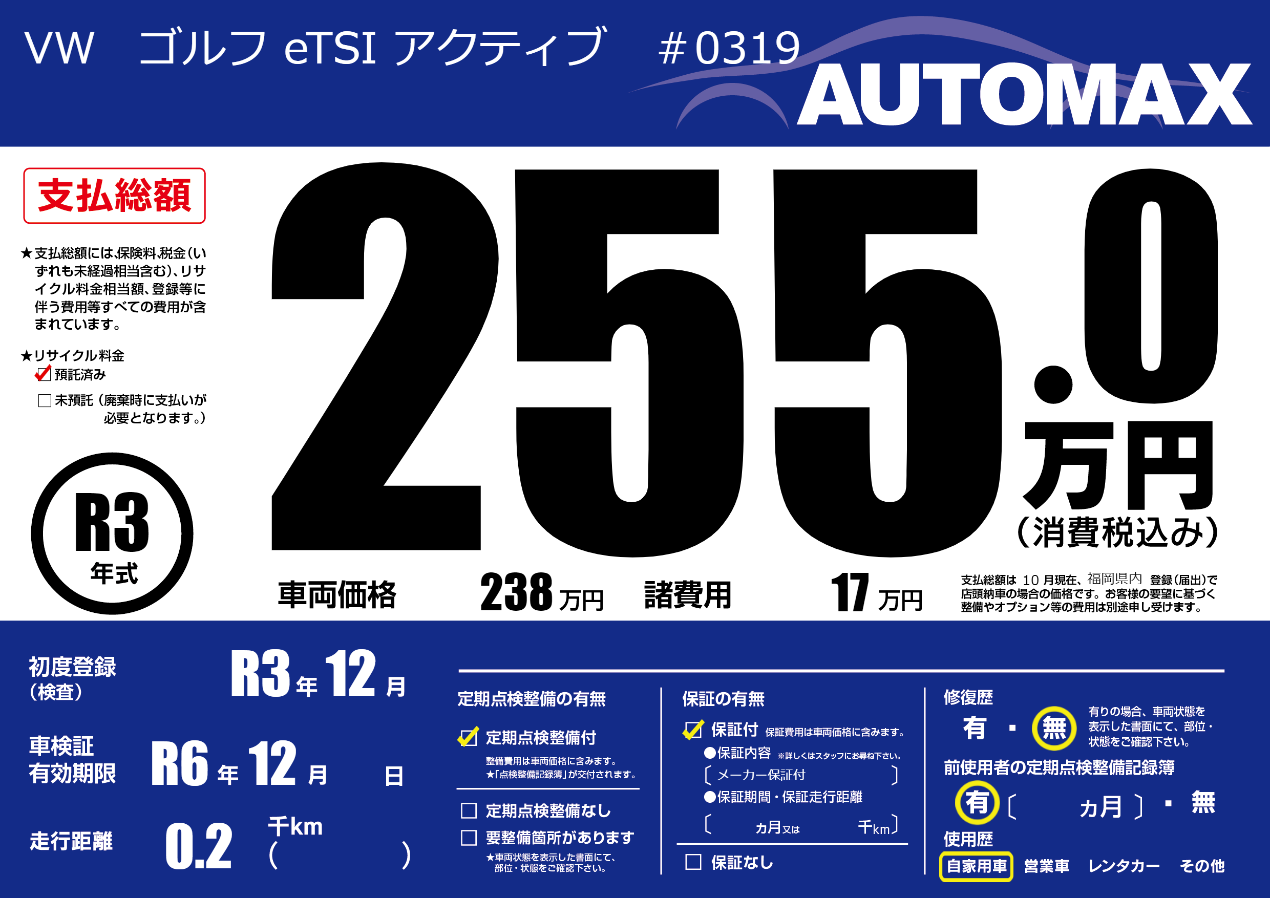 | 車名 | VW ゴルフ eTSI アクティブ #0319 | グレード ミッション 排気量 |