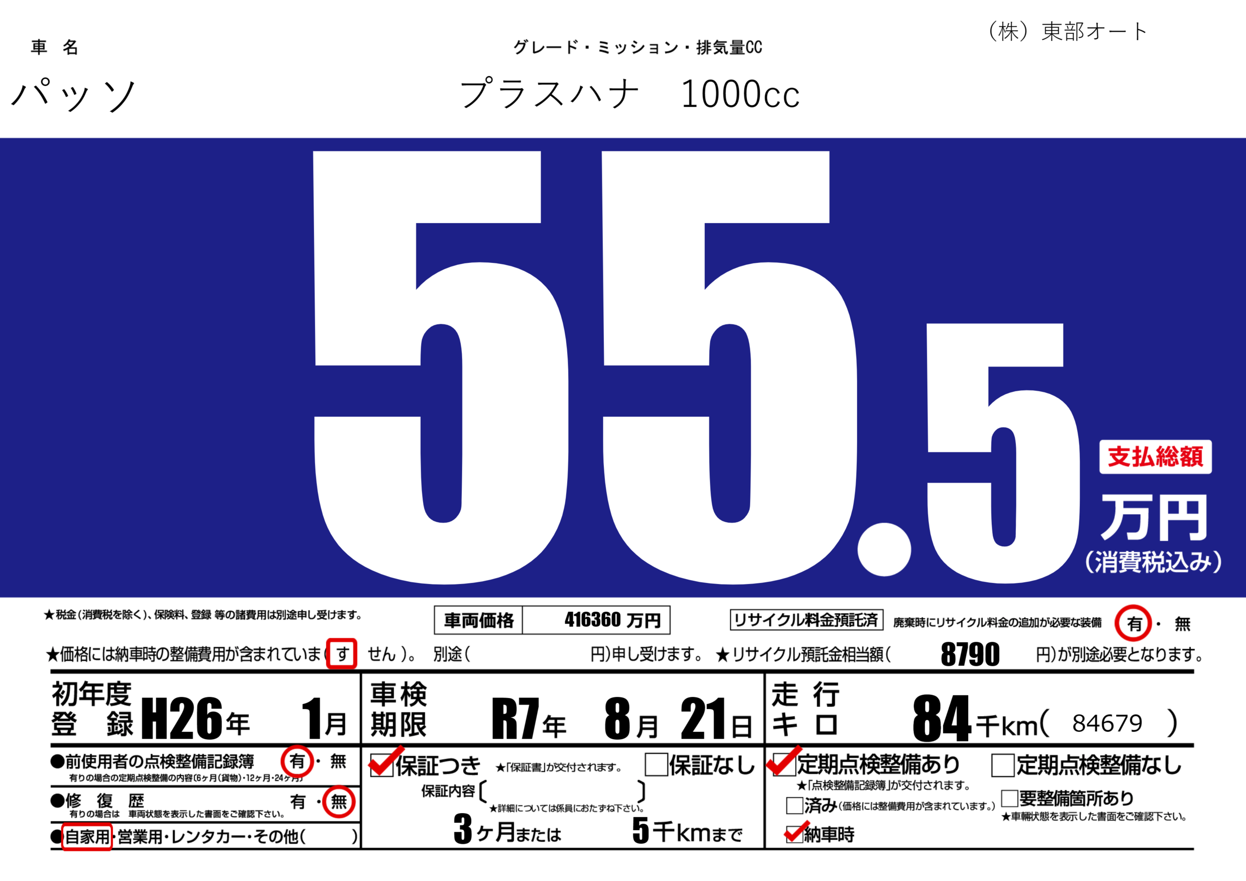 | 車名 | パッソ | グレード ミッション 排気量 |
