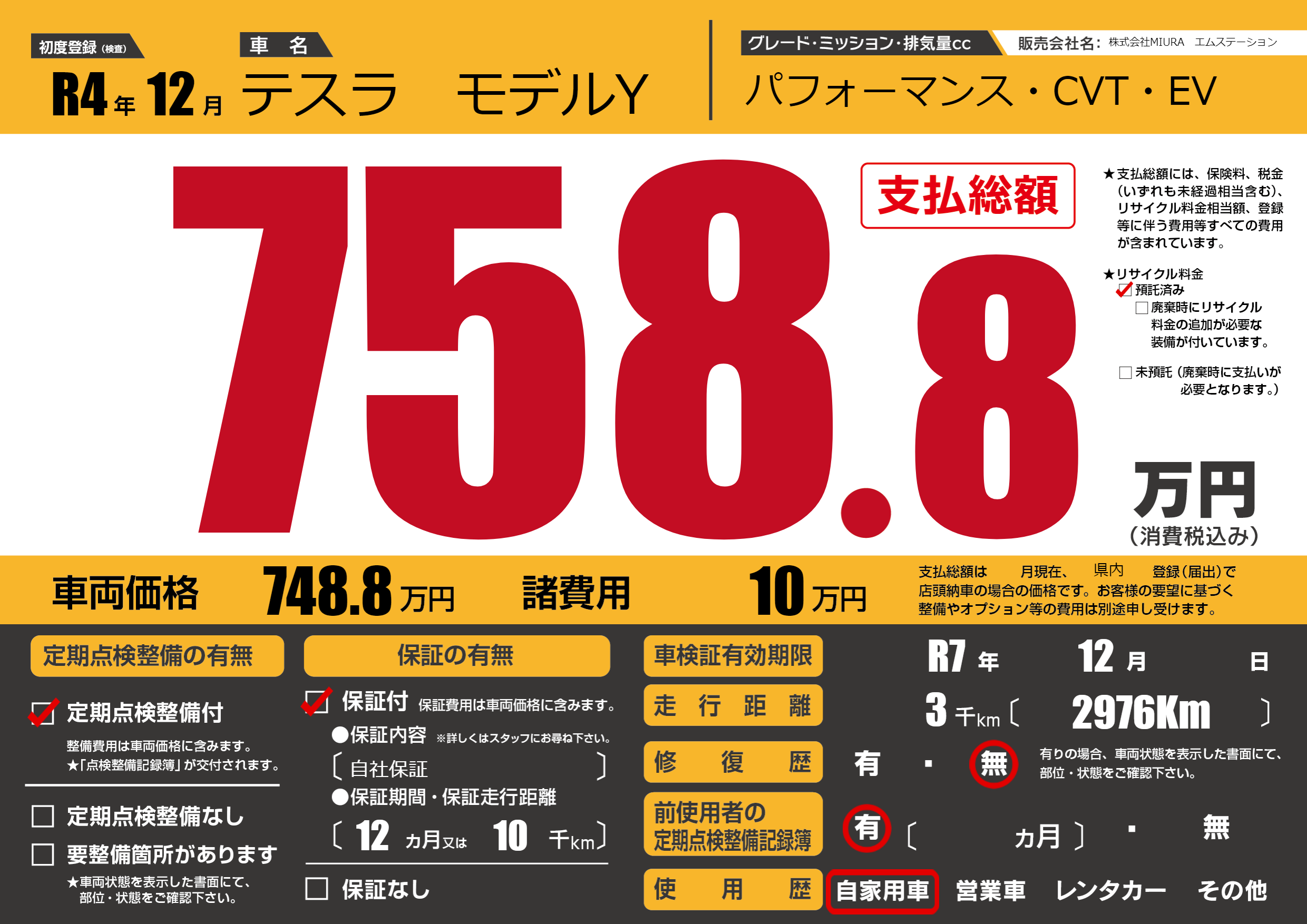 | 車名 | テスラ モデルY | グレード ミッション 排気量 |