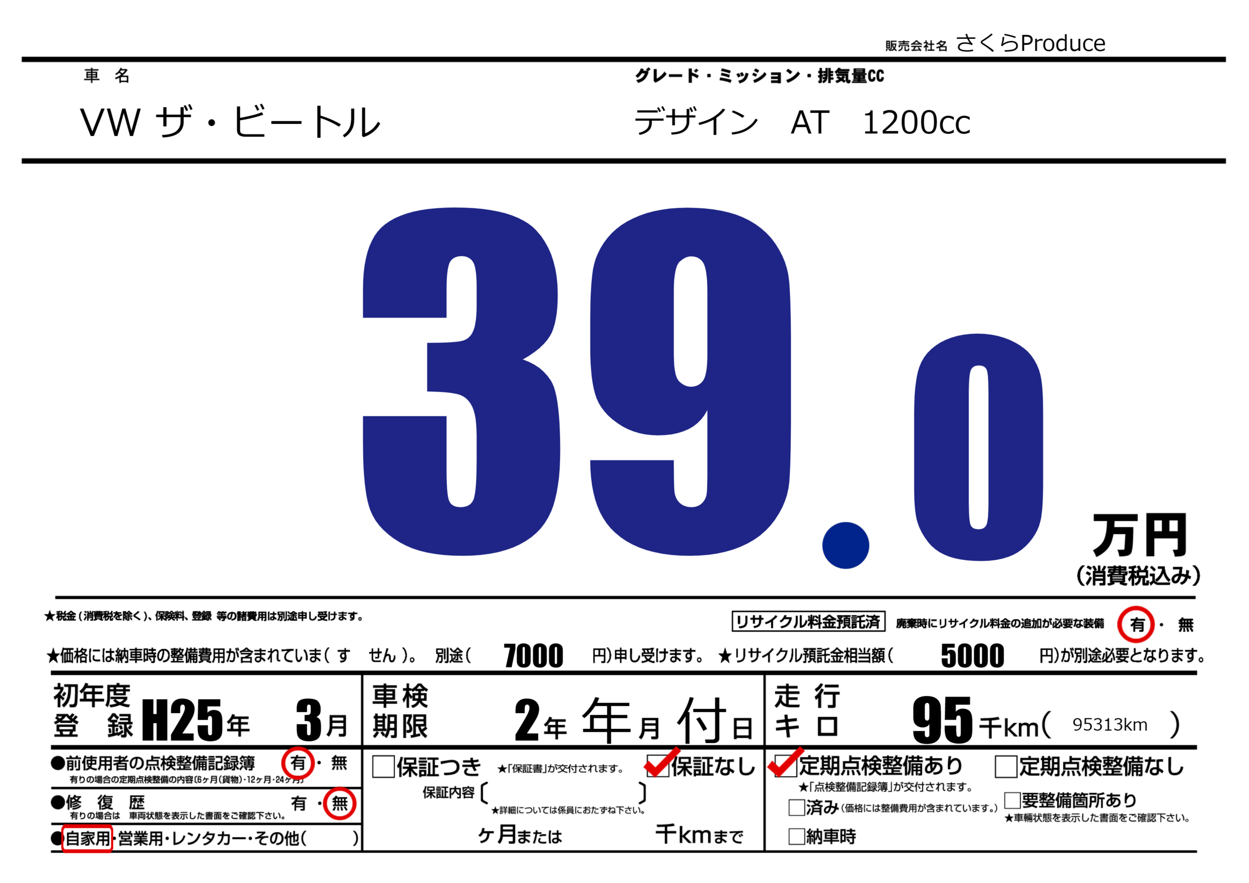| 車名 | VW ザ・ビートル | グレード ミッション 排気量 |