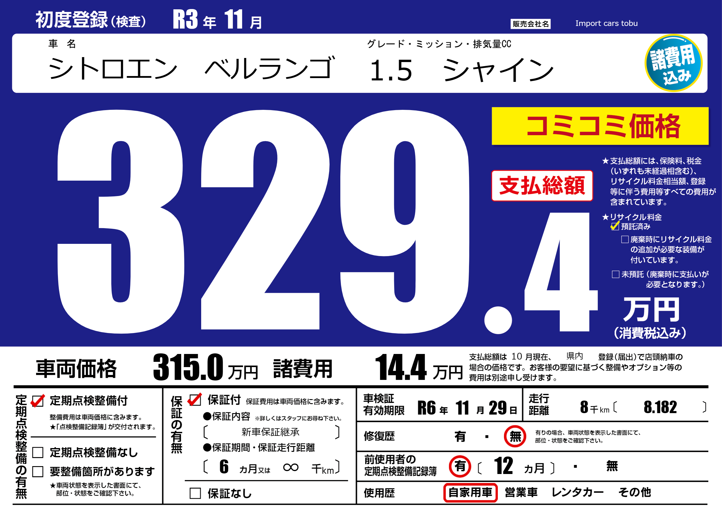 | 車名 | シトロエン ベルランゴ | グレード ミッション 排気量 |