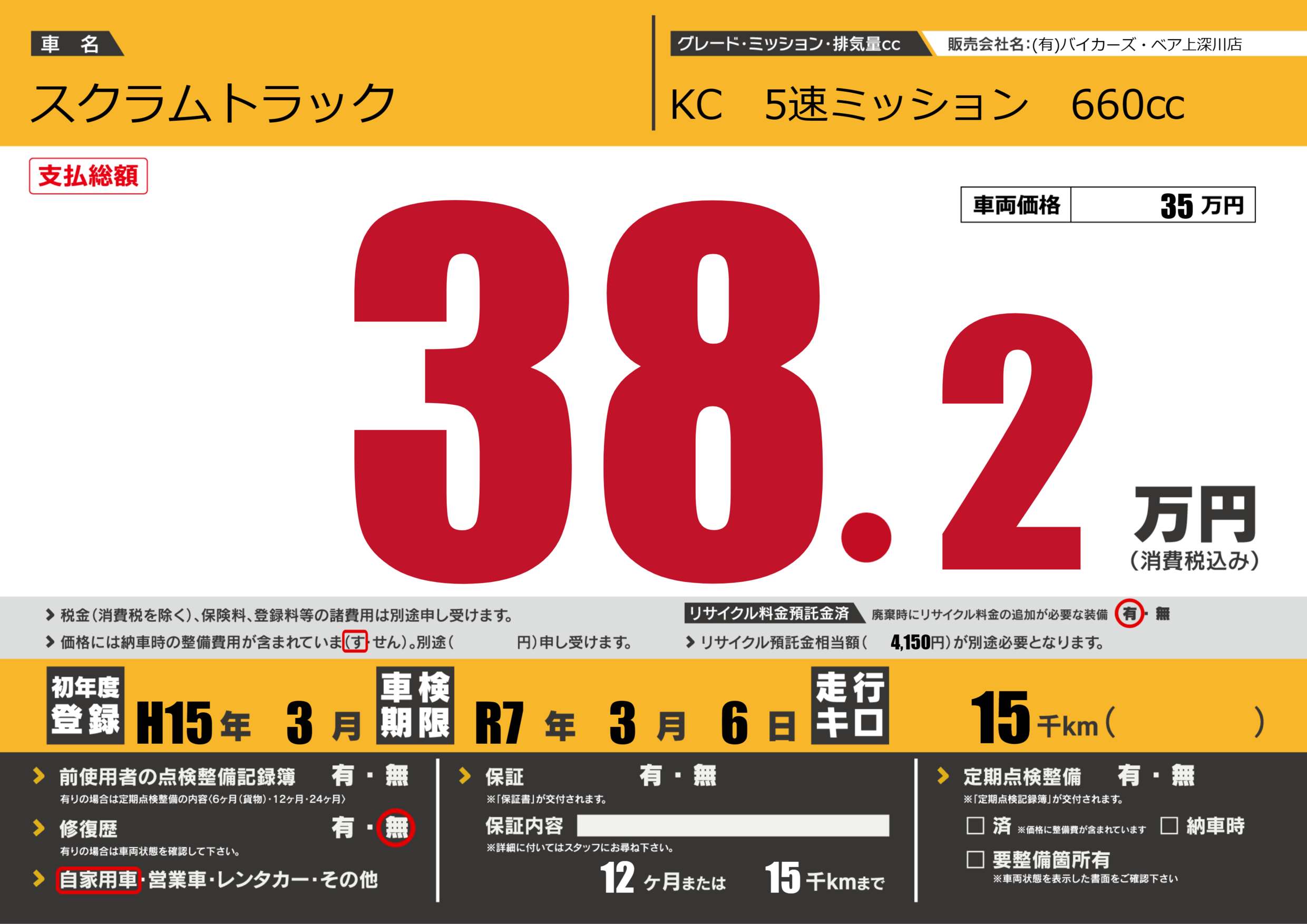 保証なし 保証内容(---) 12ヶ月または(15)千kmまで |