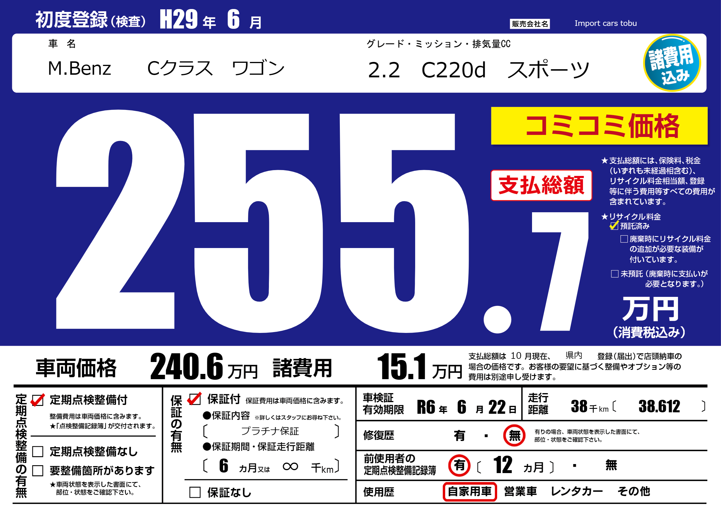 | 車名 | M.Benz Cクラス ワゴン | グレード ミッション 排気量 |