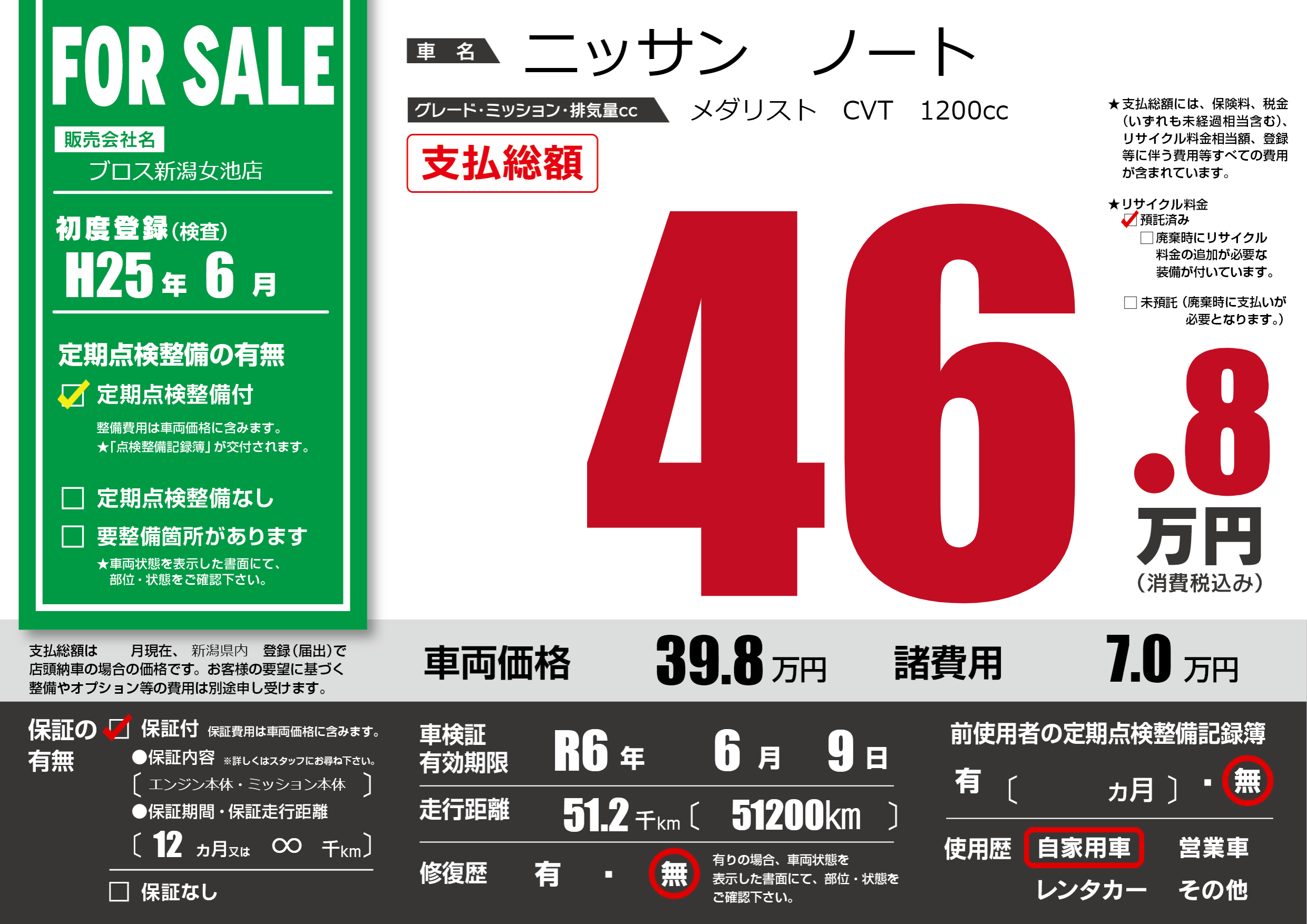 | 車名 | ニッサン ノート | グレード ミッション 排気量 |