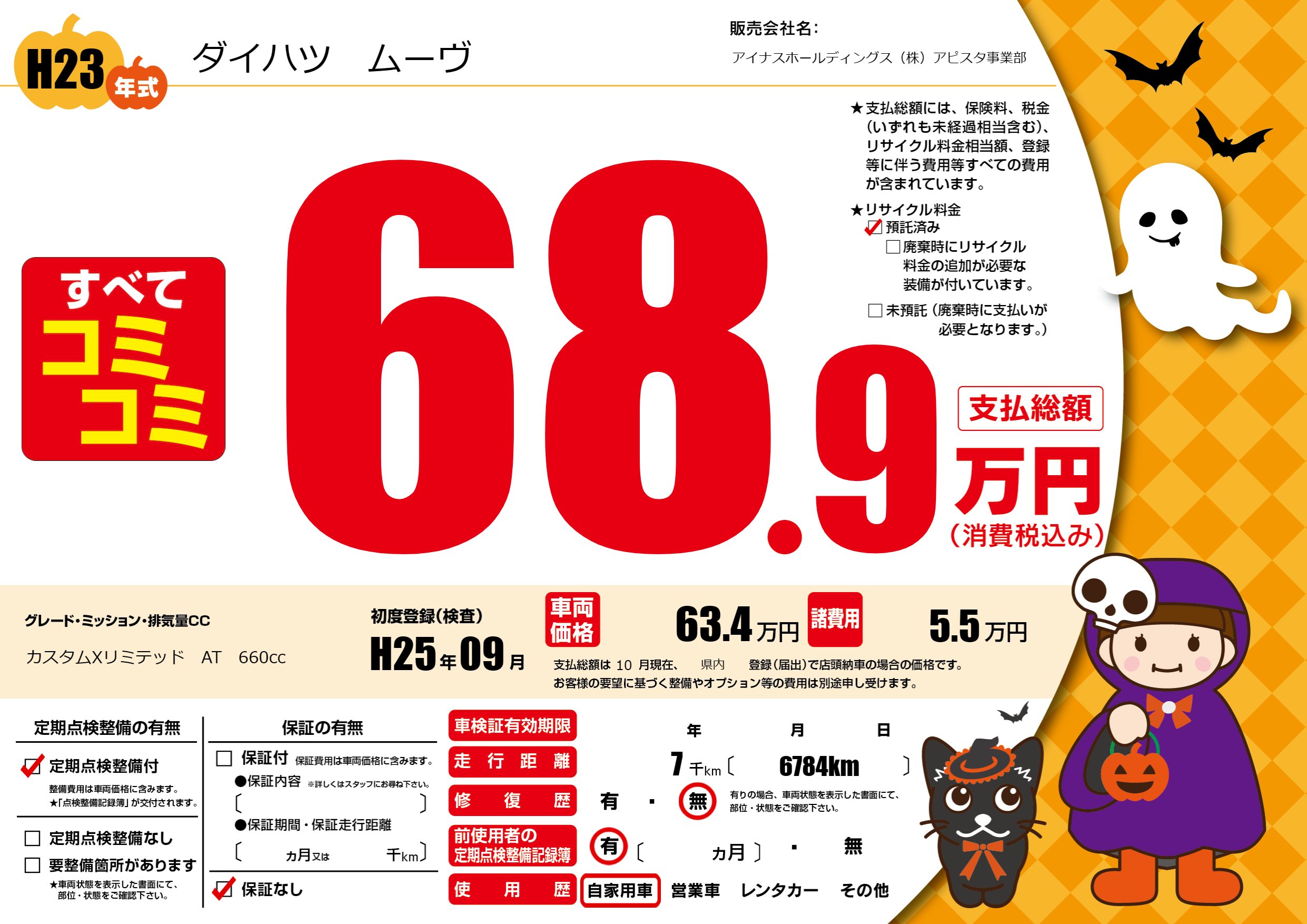| 走行キロ | 0.7万km | 初年度登録 | H25年09月 |