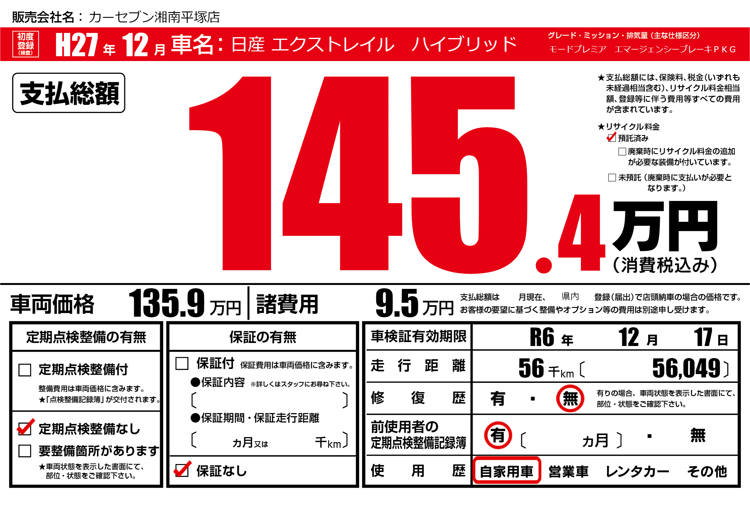 | 車名 | 日産 エクストレイル ハイブリッド | グレード ミッション 排気量 |